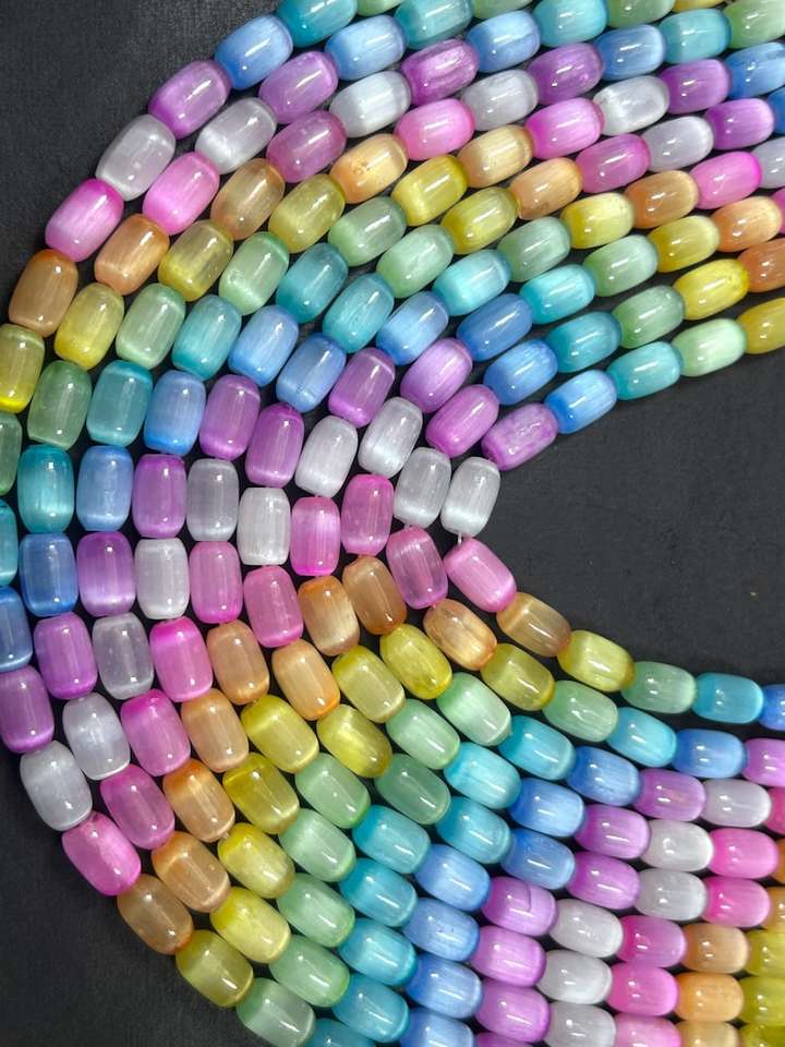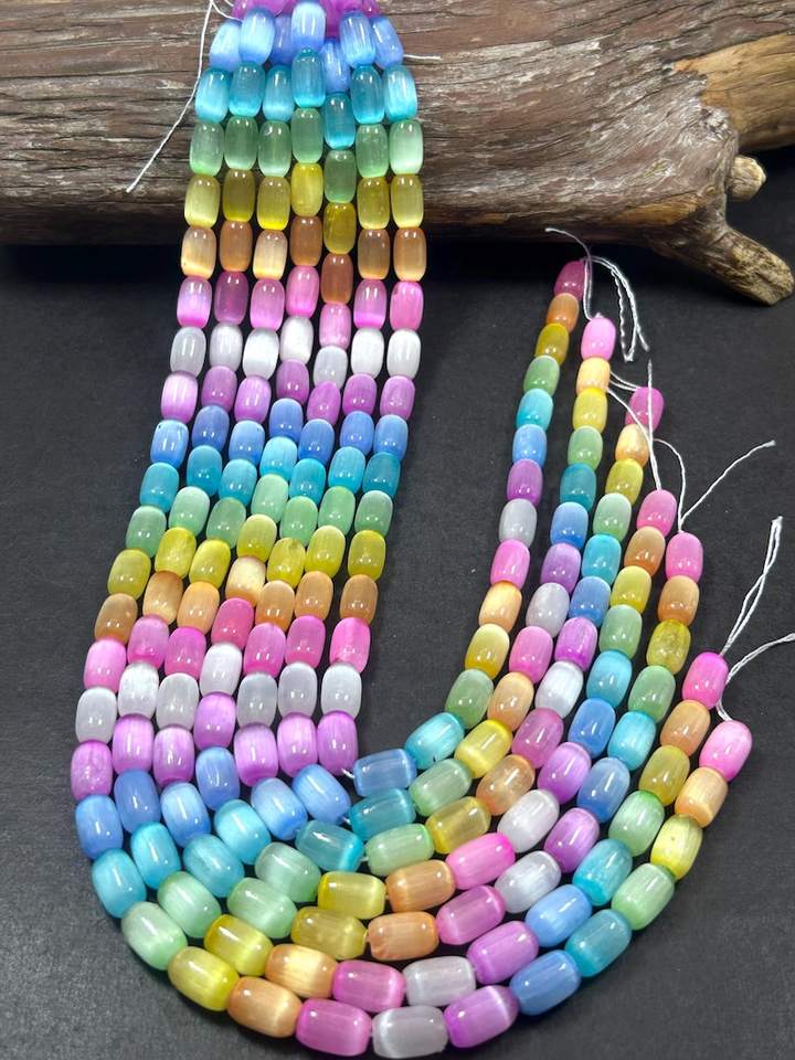 ลูกปัดพลอยเซเลไนต์สีรุ้งธรรมชาติ รูปทรงหลอด สีรุ้งสวยงาม คุณภาพสูง ความยาวเต็มเส้น 15.5 นิ้ว