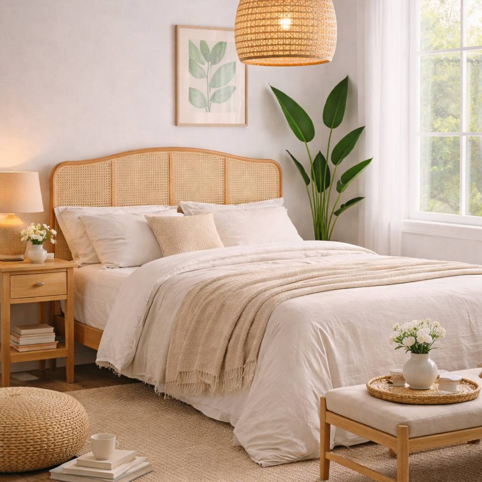 เตียงหัวเตียงโค้งหวายธรรมชาติ สานด้วยมือ สไตล์ชนบทชายทะเล โบโฮ เฟอร์นิเจอร์ห้องนอนแบบเป่าลม ของตกแต่งจากเวียดนาม