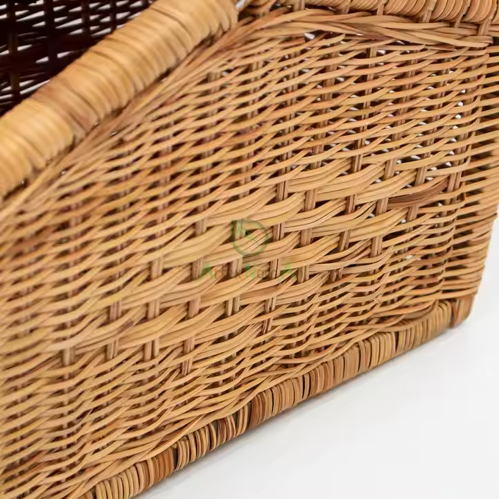 ตะกร้าปิกนิกหวายธรรมชาติพร้อมฝาปิดแบบบานพับมีด้ามจับดีไซน์ทำด้วยมือ