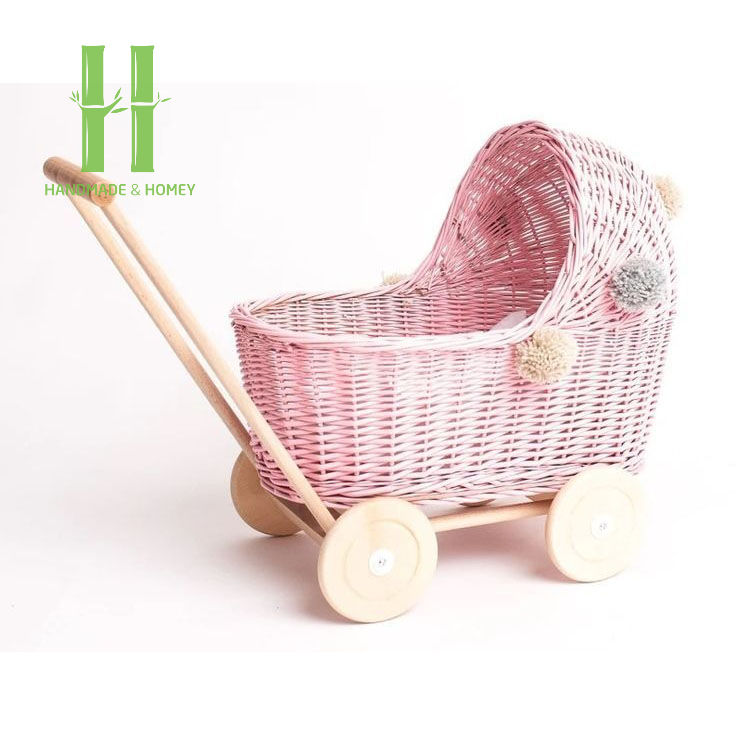 รถเข็นเด็กหวายธรรมชาติรถเข็นตุ๊กตาผ้าหวายสำหรับเด็กทารกรถเข็นตุ๊กตาผ้าหลากสีเป็นมิตรกับสิ่งแวดล้อม