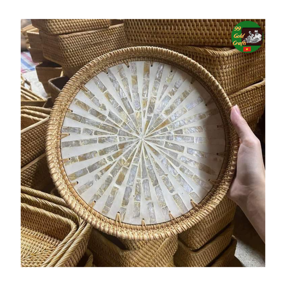 ถาดเสิร์ฟหวายธรรมชาติ ประดับมุกผสม งานฝีมือ สำหรับตกแต่งบ้าน ส่งออก ตลาด ถาดหวายผสมเซรามิก