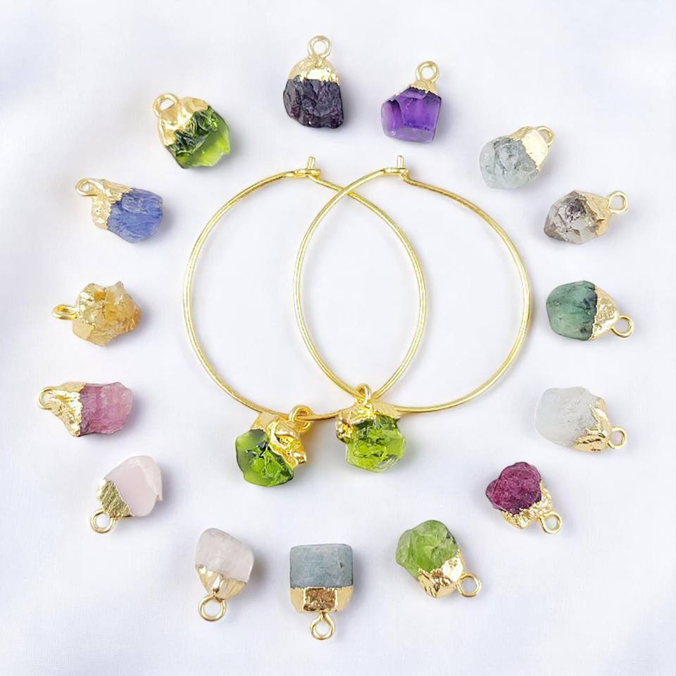 ต่างหูห่วงโรสควอตซ์ธรรมชาติ - เงินแท้ 925 ชุบทอง ประดับคริสตัล หินประจำเดือนเกิด เครื่องประดับทำมือ