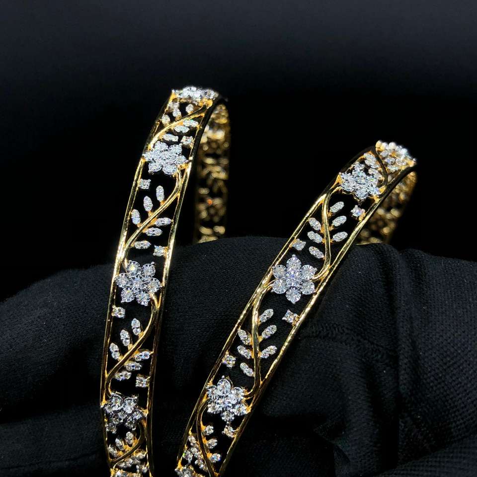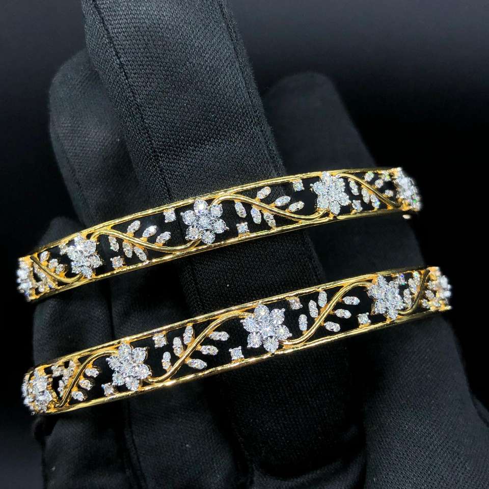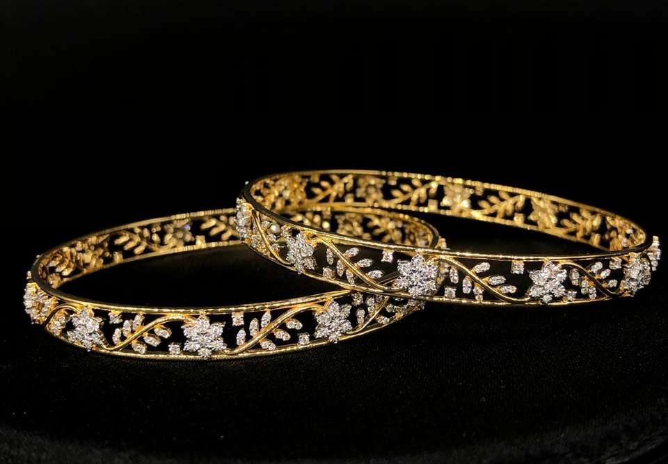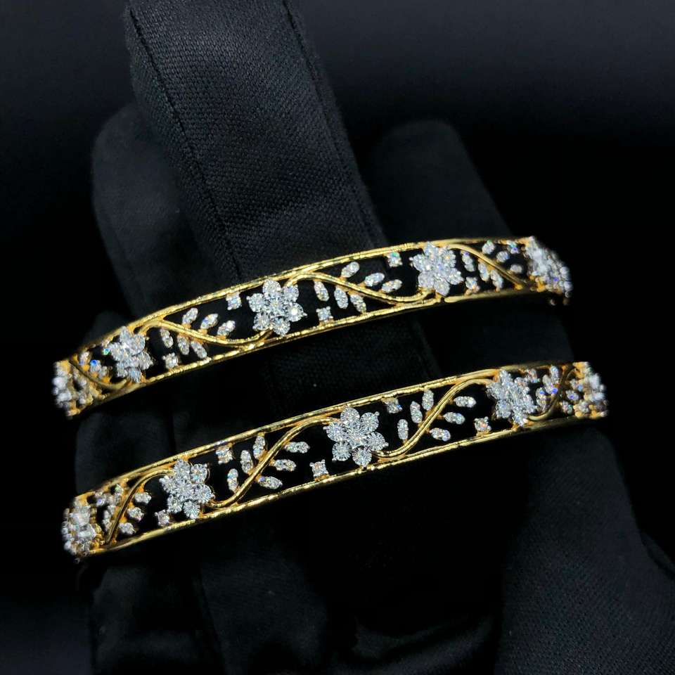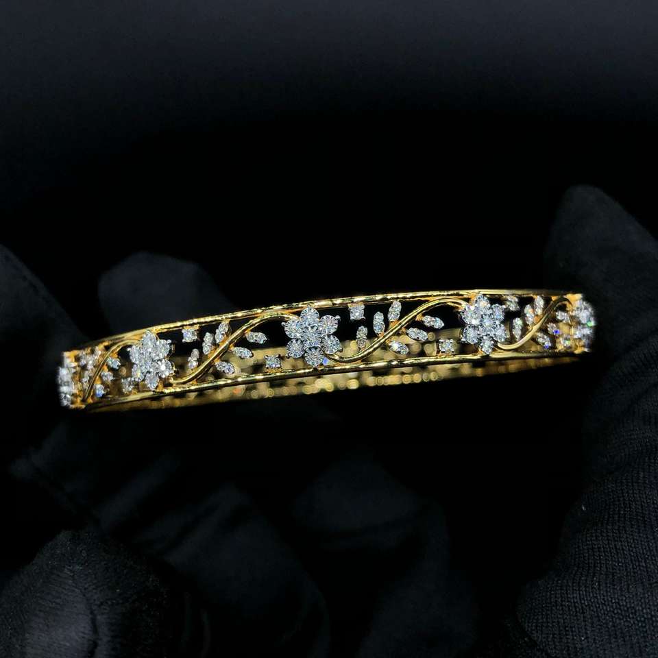 กำไลข้อมือทองคำ 18K ประดับเพชรแท้ลายดอกไม้ คู่หนึ่ง น้ำหนักรวม 2.14 กะรัต เพชรทรงกลมเจียระไนแบบบริลเลียนท์