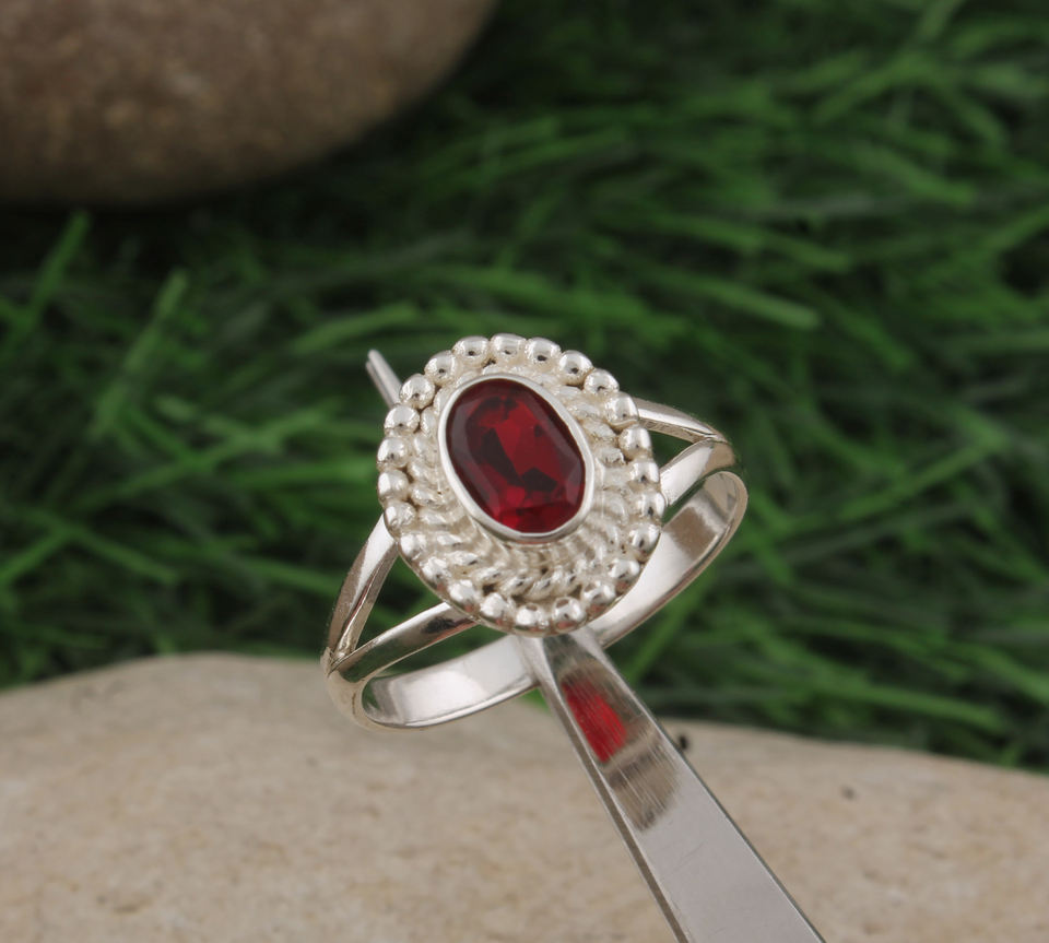 แหวนเงินแท้ 925 ประดับพลอยโกเมนแดงธรรมชาติ ดีไซน์วงแหวนแบบคลาสสิก ประดับลูกปัด เหมาะสำหรับงานปาร์ตี้ สำหรับผู้หญิง หินประจำเดือนมกราคม