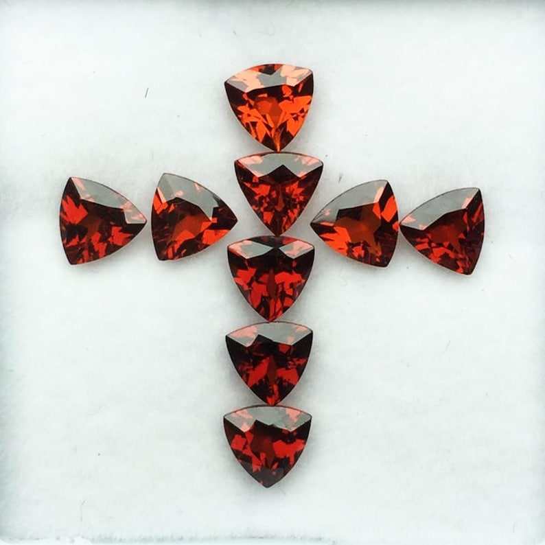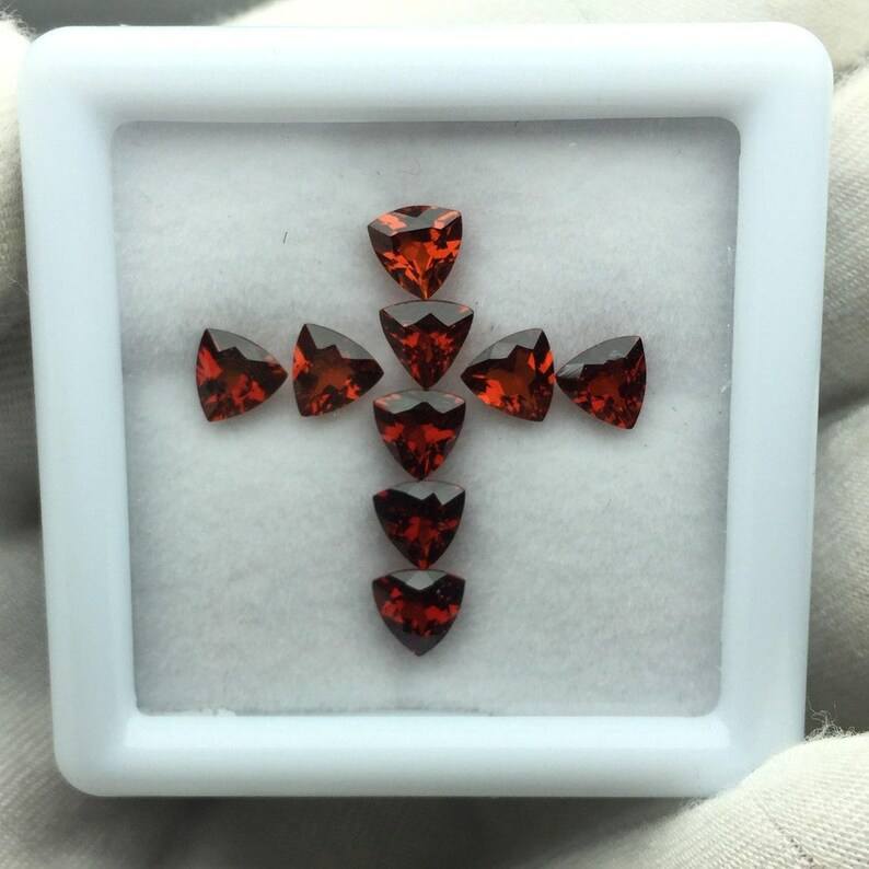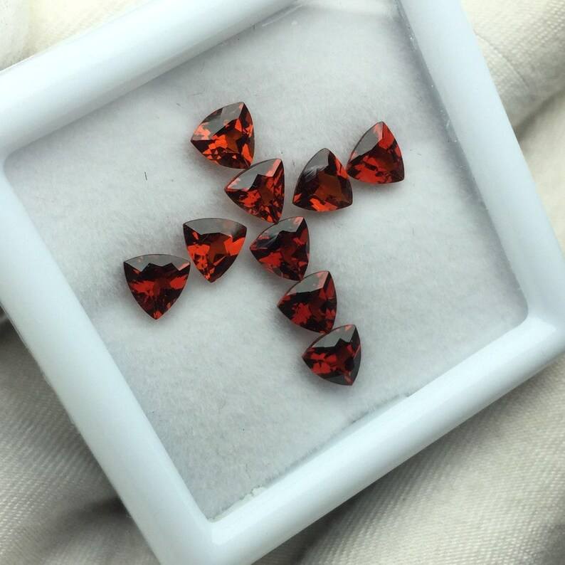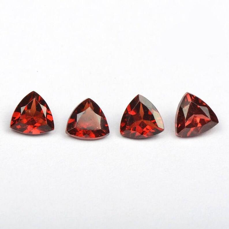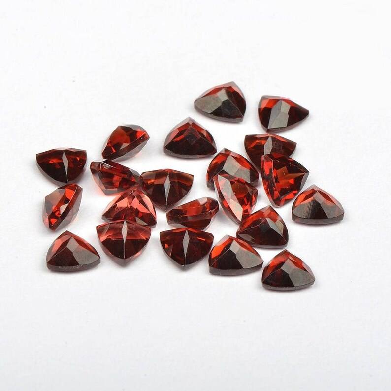พลอยโกเมนสีแดงธรรมชาติทรงทริลเลียนเจียระไนแบบเหลี่ยมเพชรพลอย ขนาดมาตรฐาน ได้รับการรับรอง ไม่ผ่านการปรับแต่ง พร้อมสำหรับการฝังในเครื่องประดับ