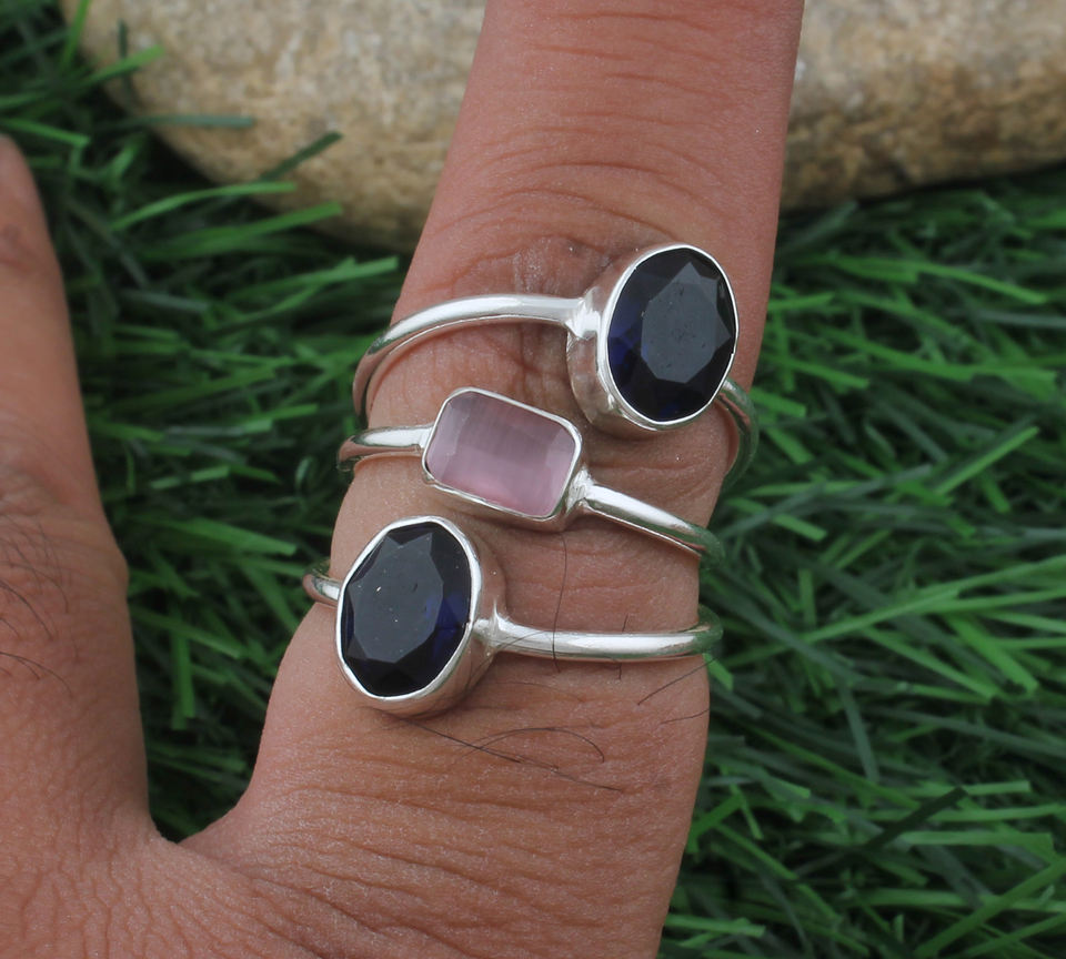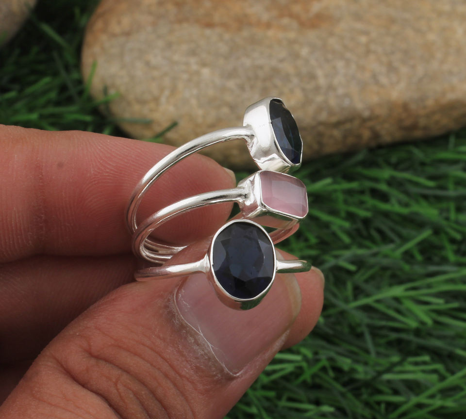 แหวนแต่งงานคลาสสิกประดับพลอยหลากชนิด 3 เม็ด ทำจากโรสควอตซ์ ไอโอไลต์ และเงินแท้ 925 สีชมพู-ฟ้า สำหรับผู้หญิง ขายส่ง