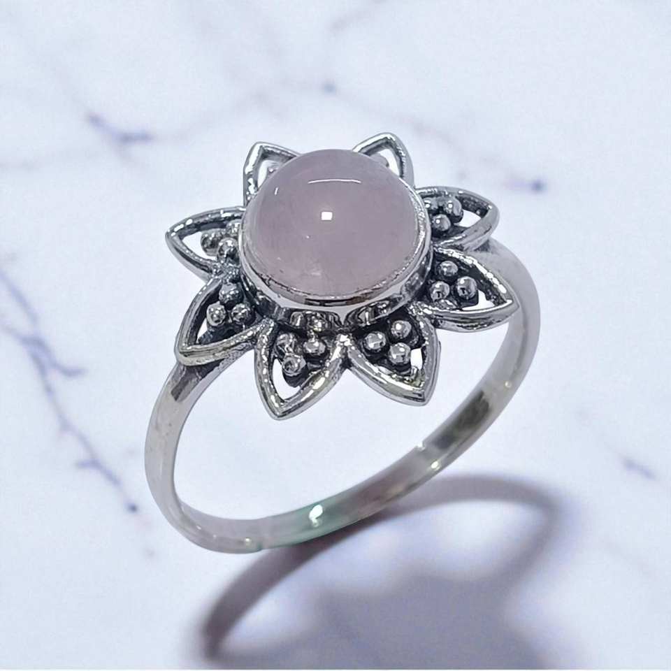 แหวนเงินแท้ 925 ประดับโรสควอตซ์ธรรมชาติและมูนสโตน ดีไซน์ดอกทานตะวัน สำหรับผู้หญิง สไตล์มินิมอล ทำมือ รูปทรงดอกไม้ แหวนโบโฮ