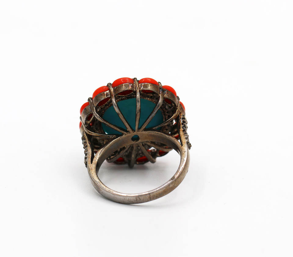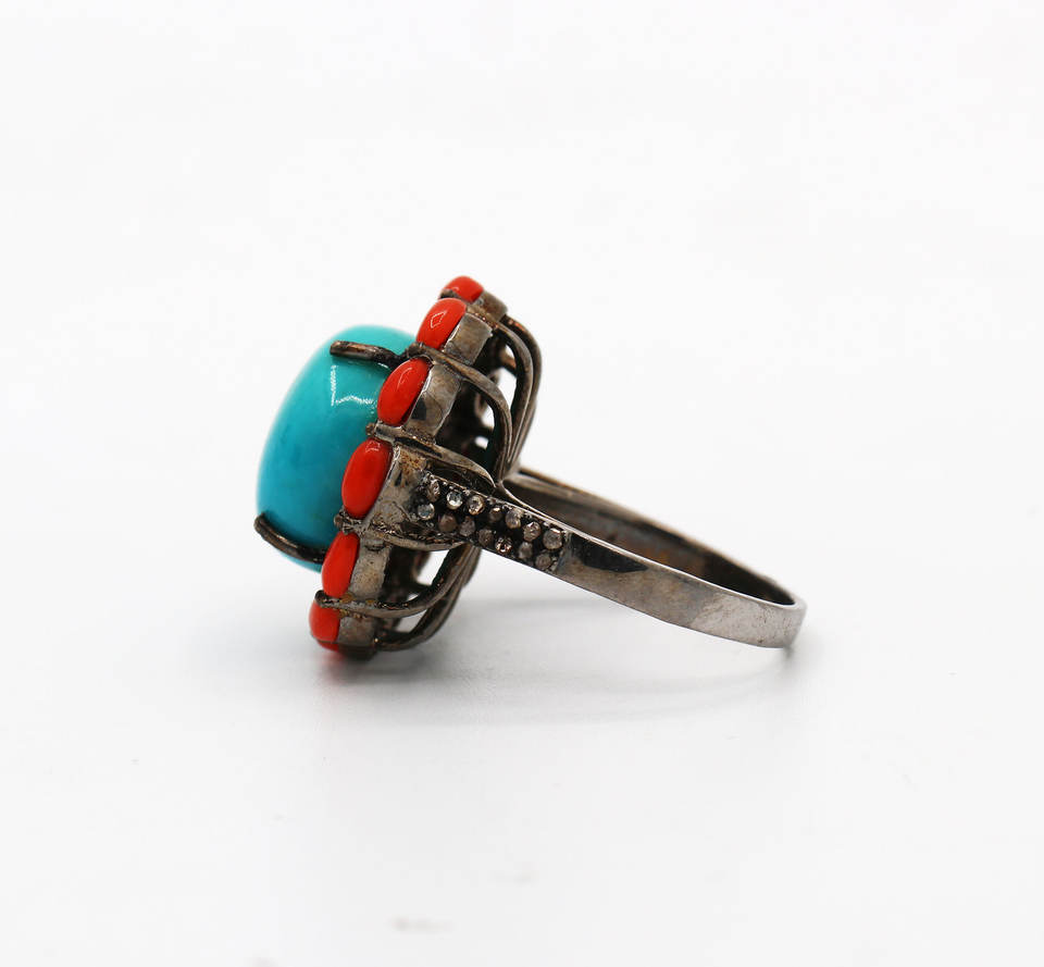 ปะการังเทอร์ควอยซ์ทรงกลมธรรมชาติพร้อมแหวนเพชร925แหวนเงินแท้เครื่องประดับทำด้วยมือ