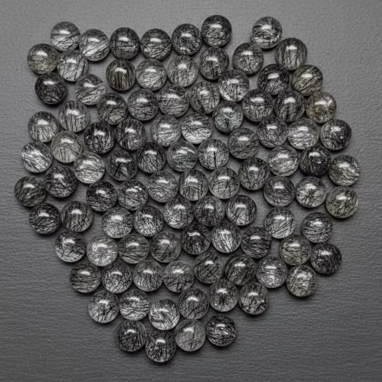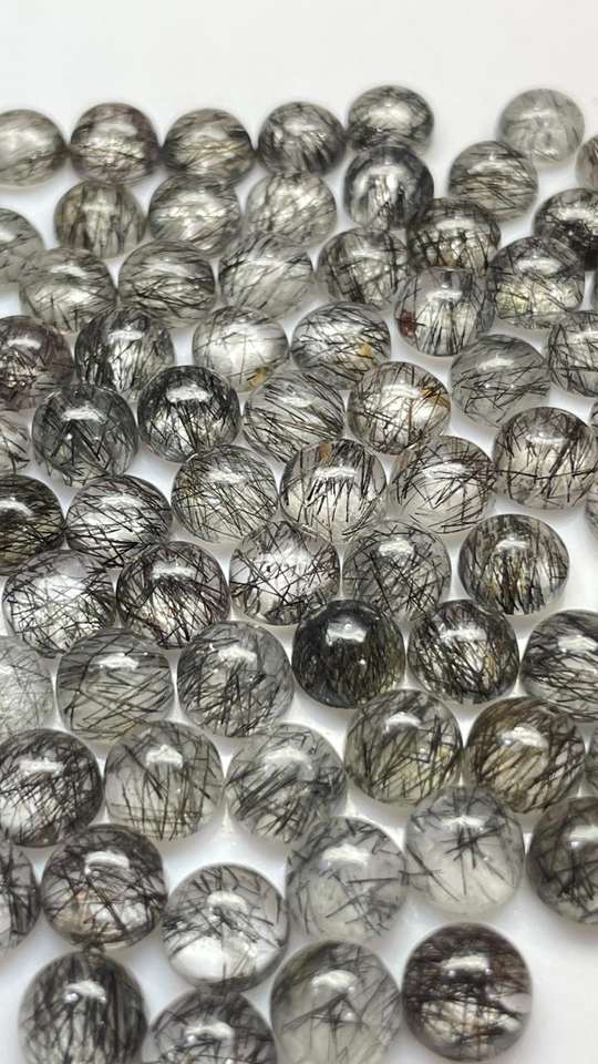 ควอตซ์รูทิเลเต็ดธรรมชาติทรงคาโบชอง สีดำ รูปทรงเข็มกลม เม็ดพลอยหลวม สำหรับเครื่องประดับทางจิตวิญญาณ ขายส่งจำนวนมาก สำหรับงานแสดงสินค้าอัญมณี