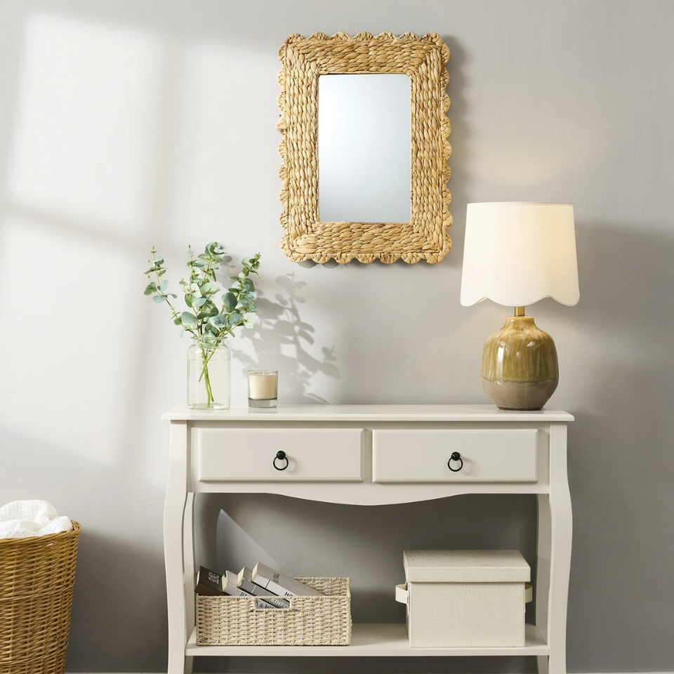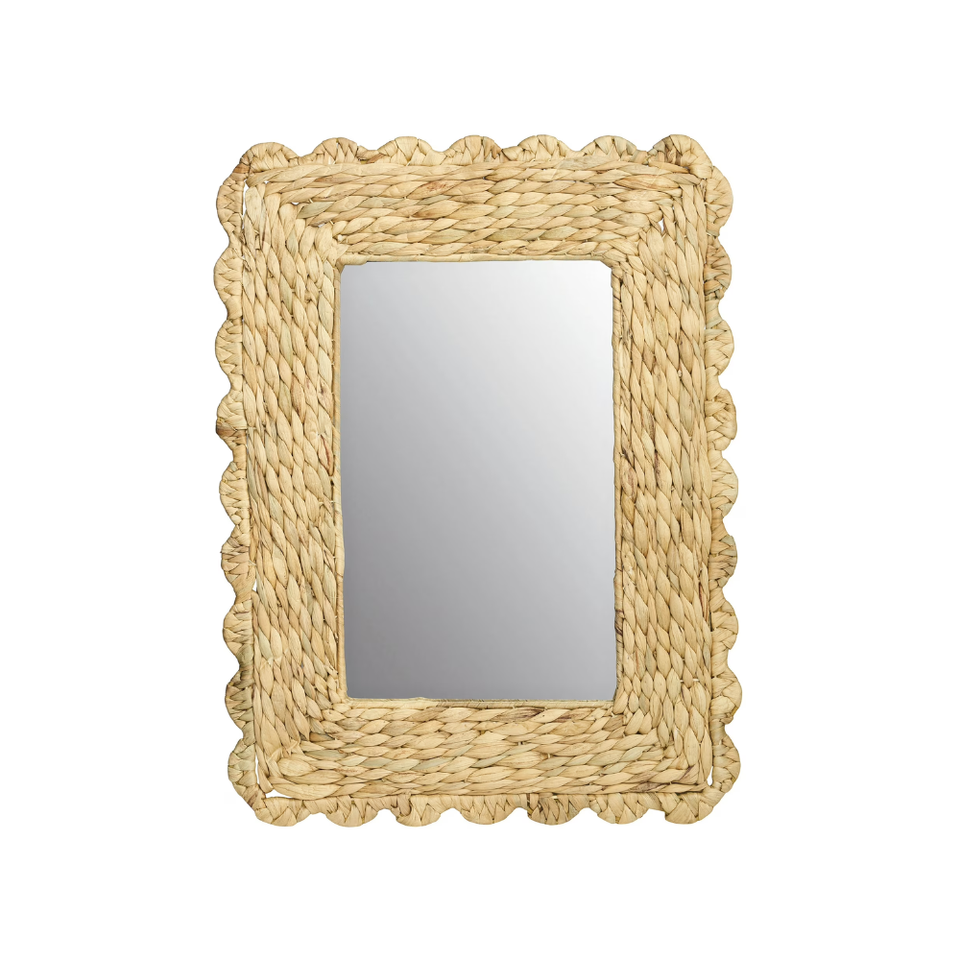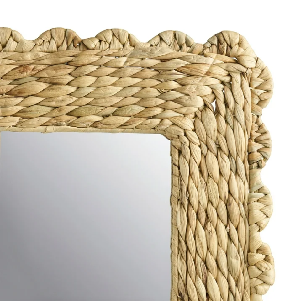 กระจกติดผนังทรงหยักจากผักตบชวาธรรมชาติ สำหรับตกแต่งห้องน้ำสไตล์ฟาร์มเฮาส์ ห้องนั่งเล่น และทางเข้าบ้าน จากเวียดนาม