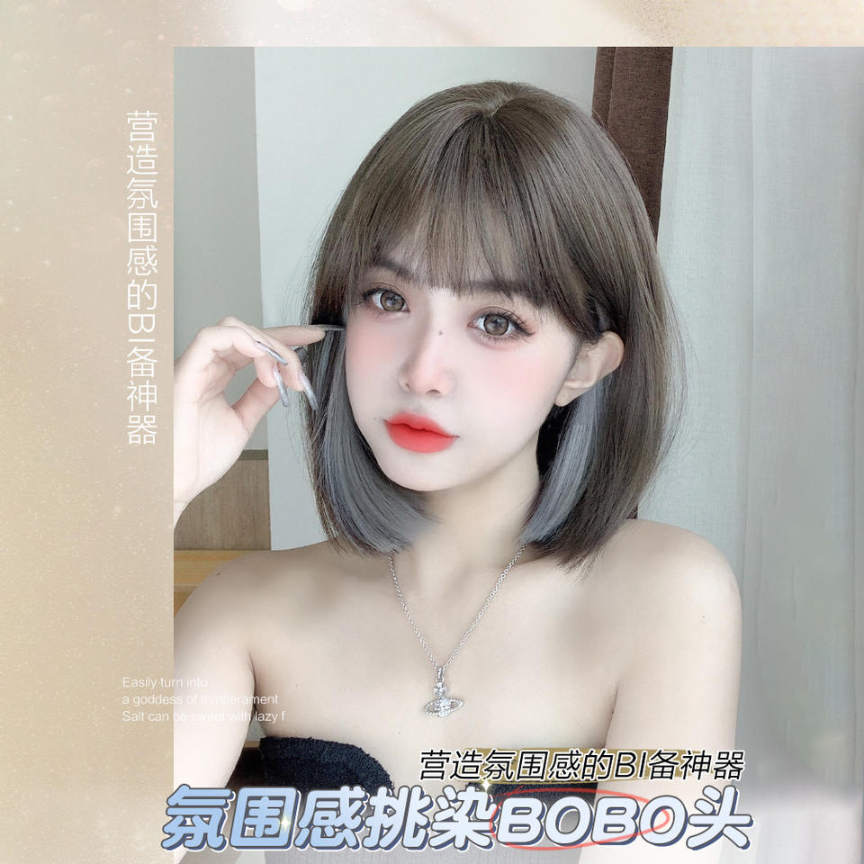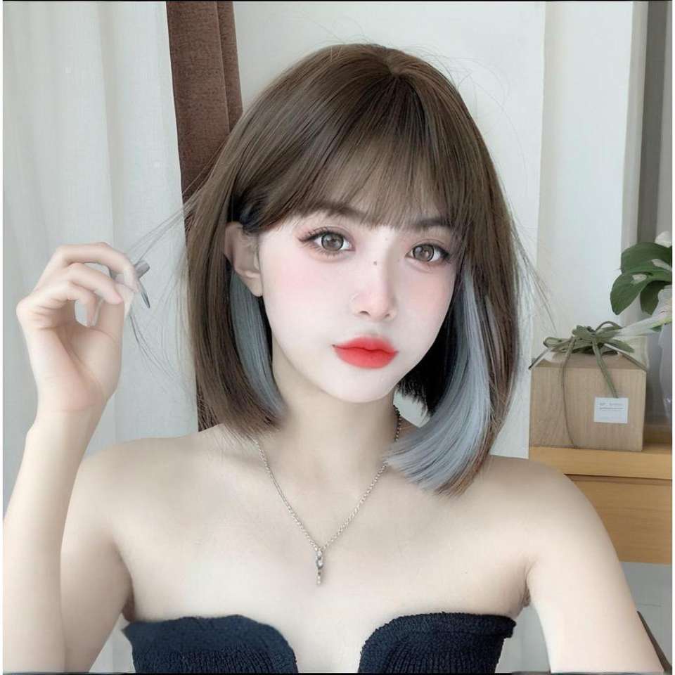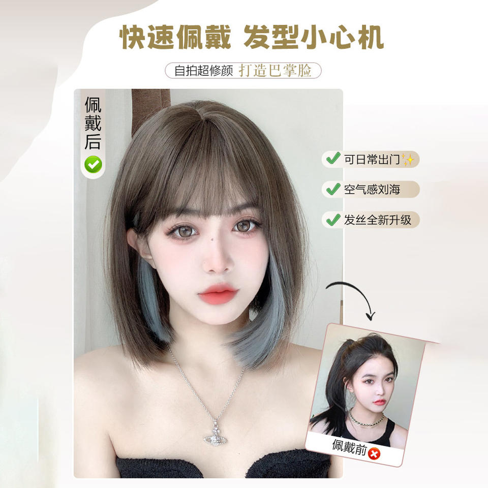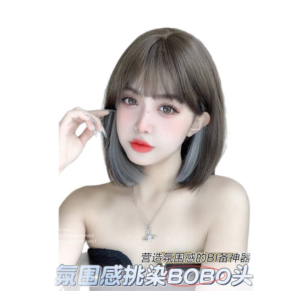 วิกผมสั้นตรงธรรมชาติพร้อมหน้าม้าไฮไลท์สำหรับผู้หญิงทุกรูปหน้า ทำจากเส้นใยคาเนคาลอน ไร้เชือกผูก