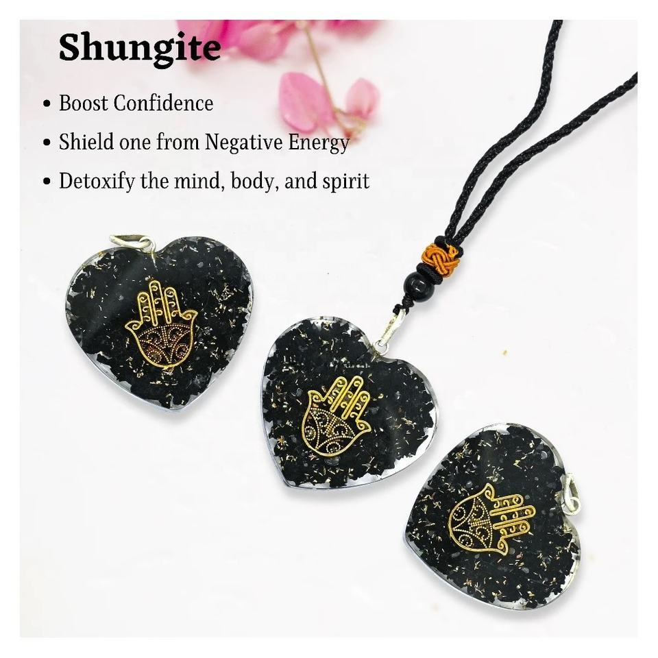 จี้หินชุงไกต์ธรรมชาติทำมือจากอินเดีย รูปหัวใจ ลายฮัมซา ขัดเงา ขนาด 1.5 นิ้ว ป้องกันคลื่นแม่เหล็กไฟฟ้า ประเภทอาเกต สำหรับเสริมฮวงจุ้ย