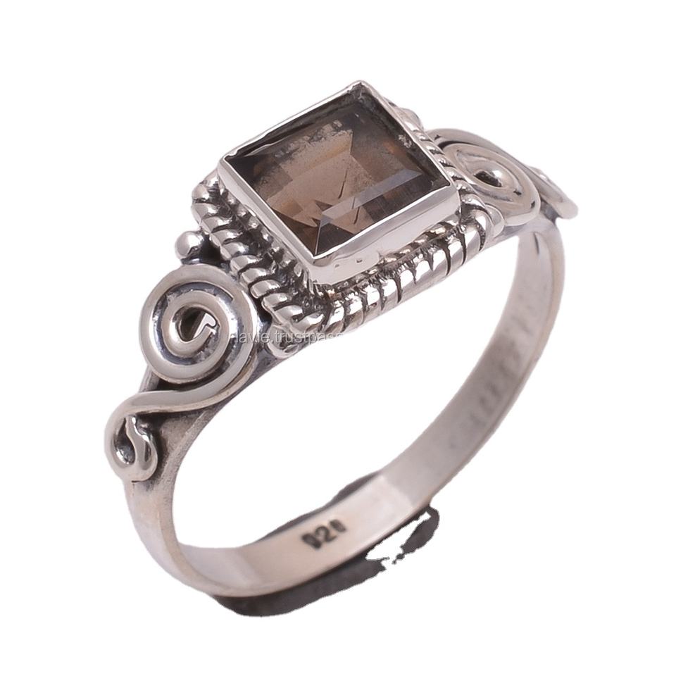 ธรรมชาติ Smoky แหวนควอตซ์925สเตอร์ลิงเครื่องประดับขายส่งอินเดียแฮนด์เมดปรับแหวนเงินผู้ผลิต