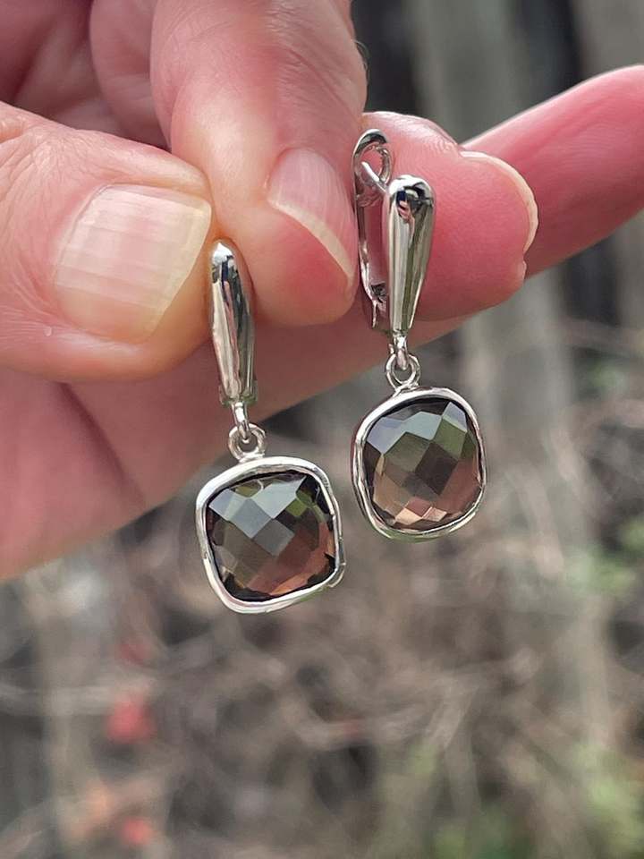ต่างหูห้อยหินควอทซ์สโมคกี้ทรงสี่เหลี่ยมธรรมชาติเครื่องประดับแฮนด์เมด925เงินแท้น้ำหนักเบาของขวัญสไตล์โบโฮที่หรูหรา