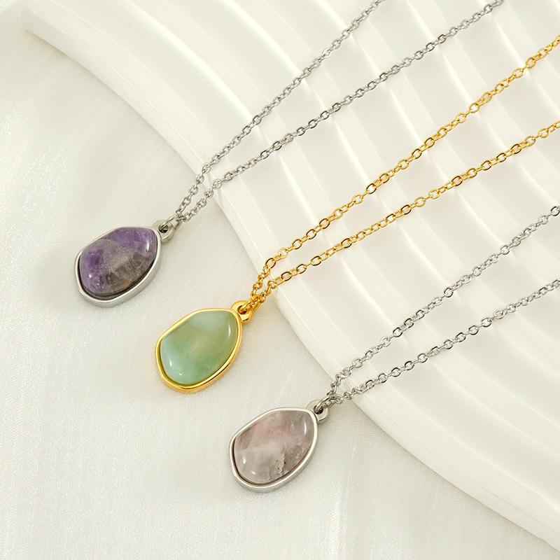 สร้อยคอจี้หินธรรมชาติทำจากสเตนเลสสตีลสร้อยคอหินอเมทิสต์สำหรับผู้หญิงจี้หินควอตซ์หยกแบบไม่สม่ำเสมอ