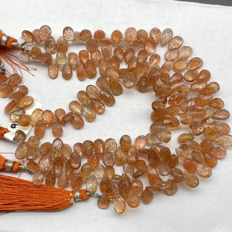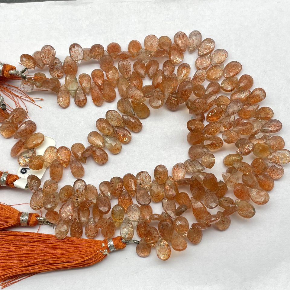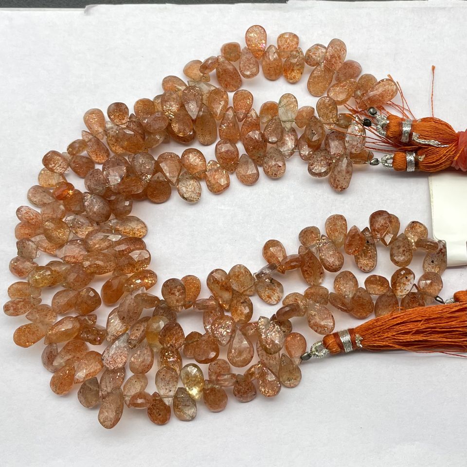 ลูกปัดออเรนจ์แบบเหลี่ยมเพชรพลอยลูกปัดบริโอเลตต์ทรงลูกแพร์ลายซันสโตนขนาด7นิ้วลูกปัดทอ้านข้าง
