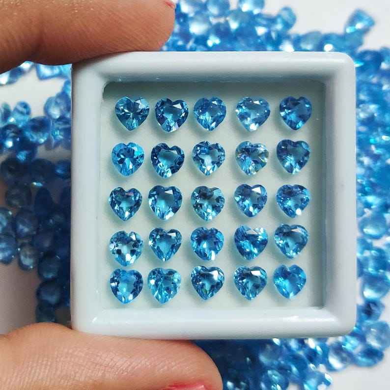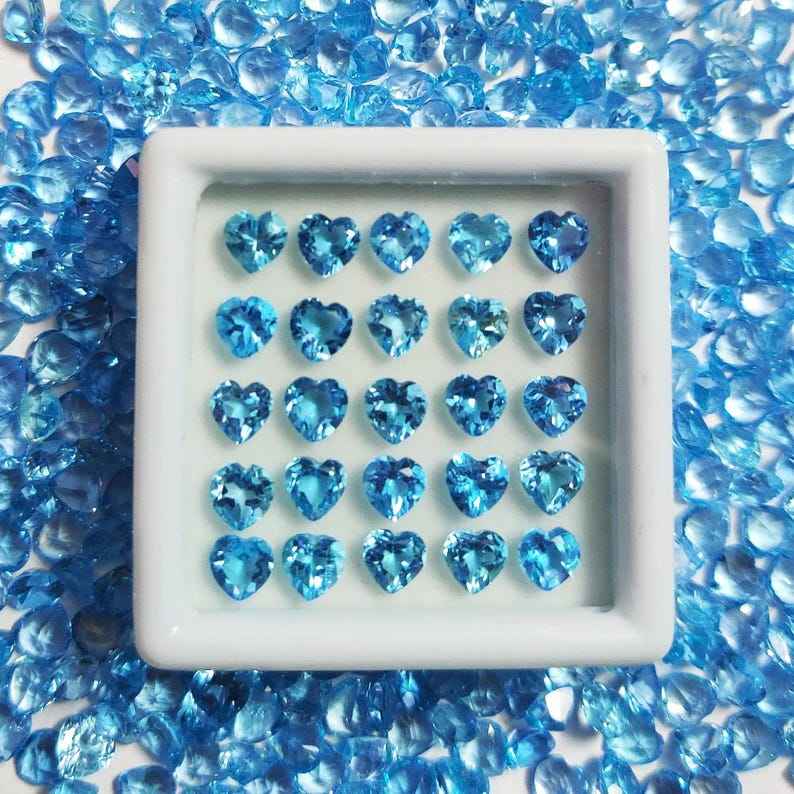 บลูโทแพซสวิสธรรมชาติทรงหัวใจเจียระไนแบบเหลี่ยม ขนาดมาตรฐาน พร้อมใบรับรอง ไม่ผ่านการปรับแต่ง พร้อมสำหรับการฝังในเครื่องประดับ