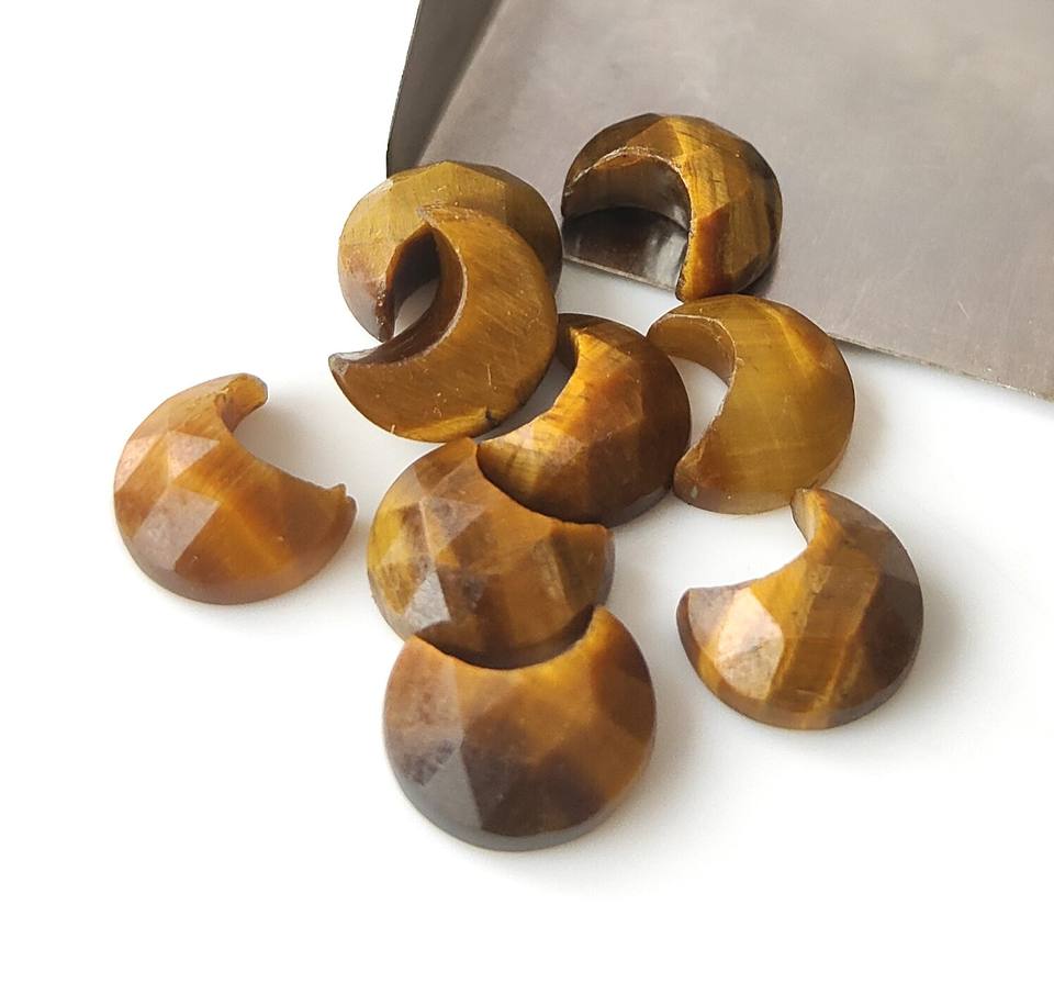 พลอยไทเกอร์อายธรรมชาติขายส่ง ขนาด 8 มม.-30 มม. รูปทรงพระจันทร์เสี้ยวเจียระไนแบบโรสคัท ด้านหลังแบน สีทอง พลอยหลวมหลากสี