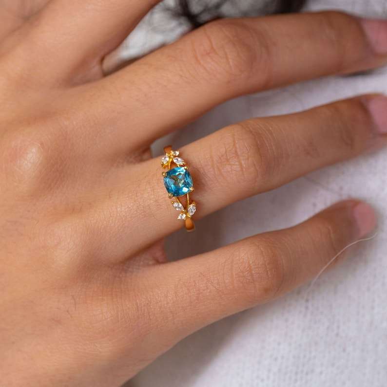 แหวนโทแพซธรรมชาติ แหวนโทแพซลอนดอนบลูธรรมชาติ แหวนเงินแท้ 925 ชุบทอง 14K ของขวัญวันเกิดสำหรับเธอ