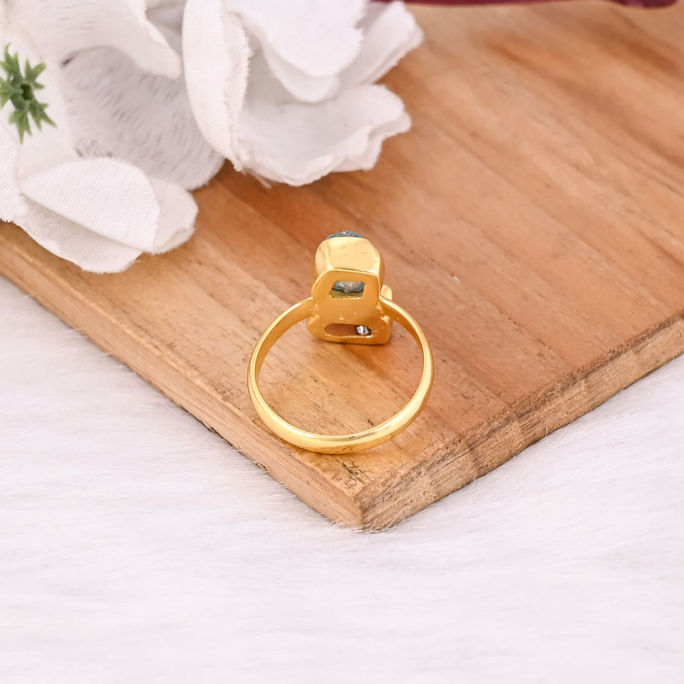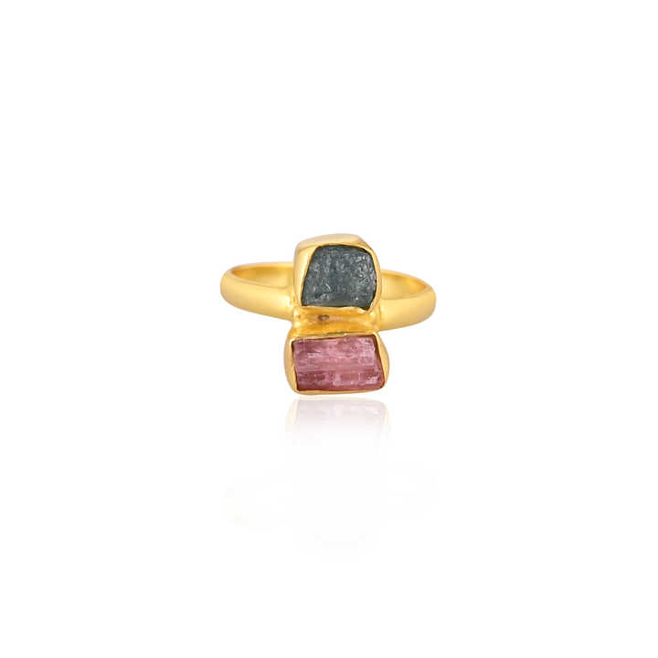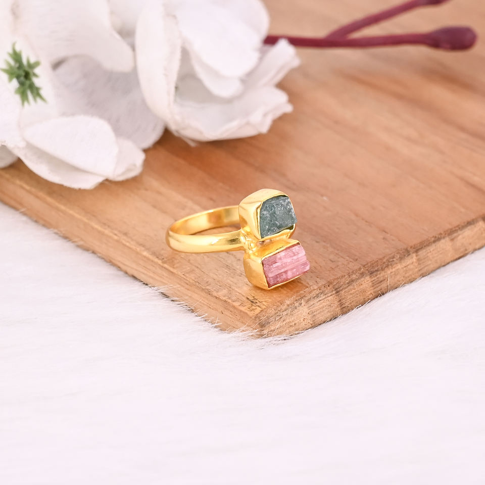 แหวนพลอยทัวร์มาลีนแบบหยาบอัญมณีธรรมชาติ925เนื้อสเตอร์ลิงสีเหลืองทองทำด้วยมือขายส่ง