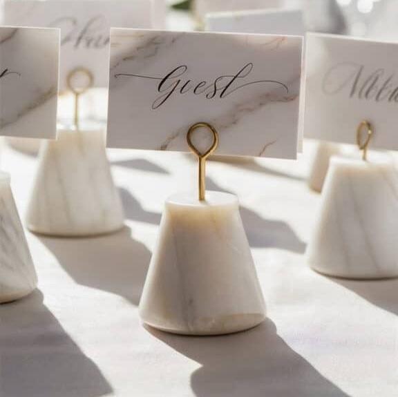 ชุดที่วางป้ายชื่อแขกงานแต่งงาน ทำจากหินอ่อนธรรมชาติ ดีไซน์มินิมอล ใช้ตั้งบนโต๊ะ สำหรับแสดงชื่อแขก หรือใช้เป็นที่ใส่บัตร หรือที่ใส่โน้ต
