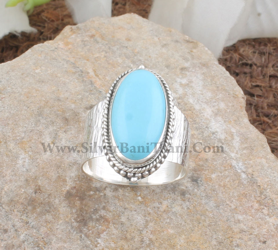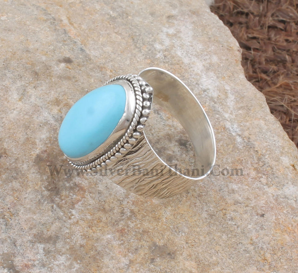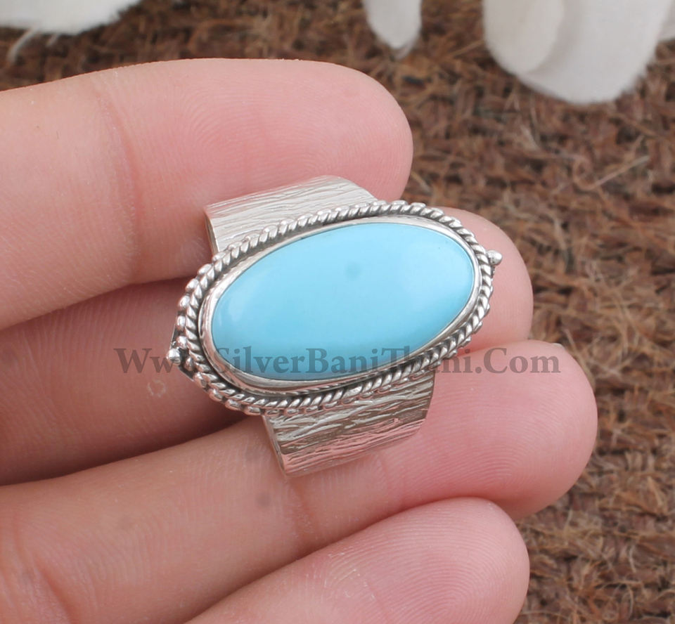 แหวนเงินแท้ 925 ประดับเทอร์ควอยซ์ธรรมชาติทรงวงแหวน ฝังหินสีน้ำเงิน งานแฮนด์เมด สไตล์ตะวันตก สำหรับทั้งชายและหญิง
