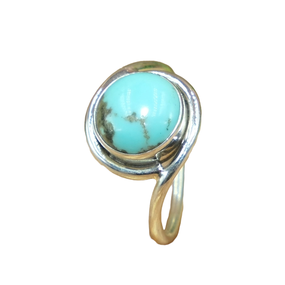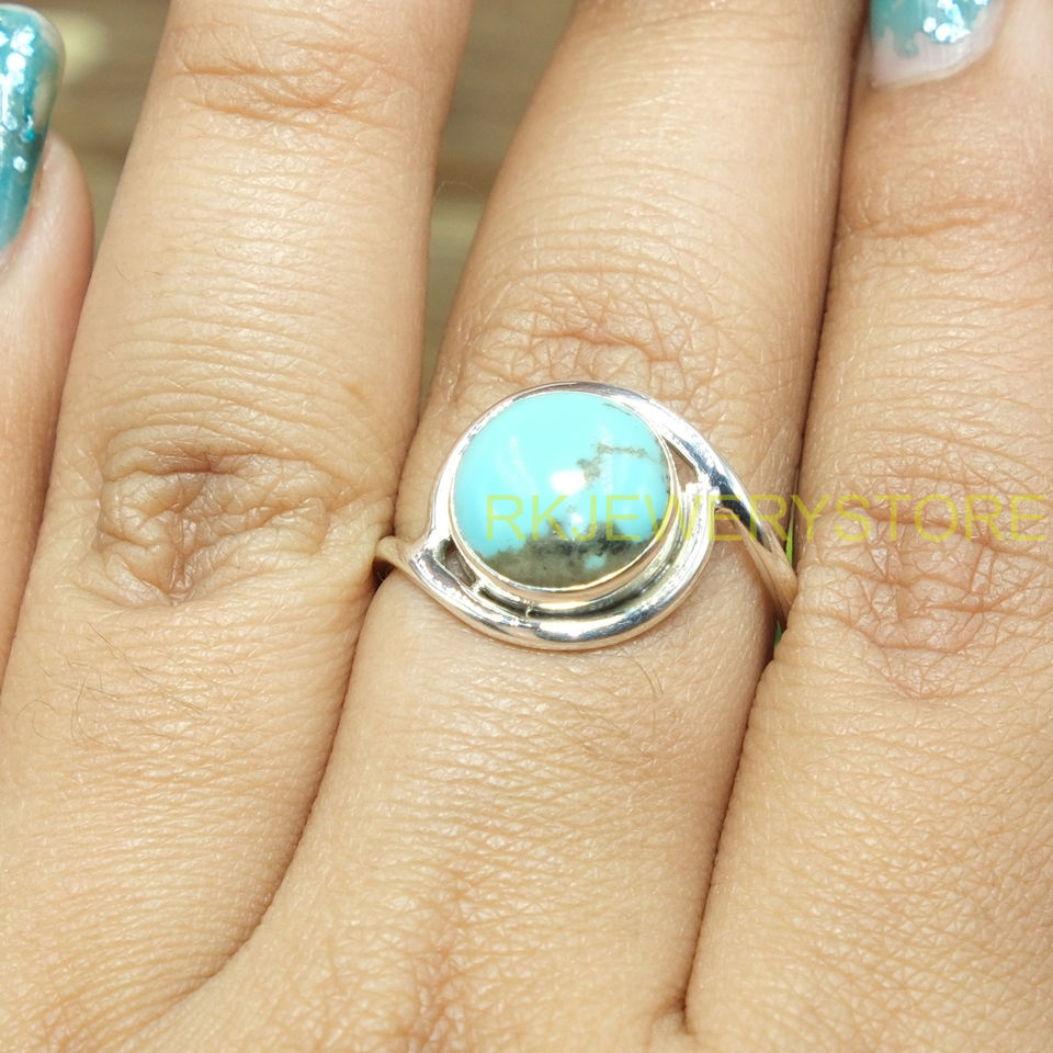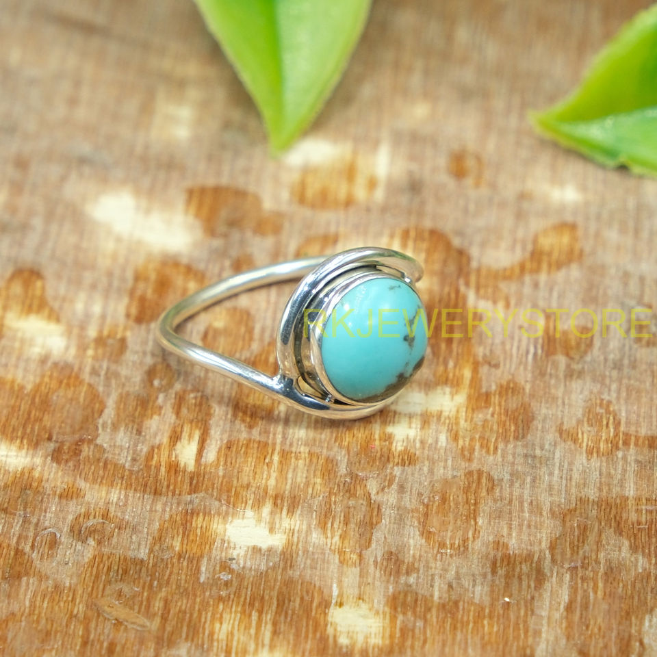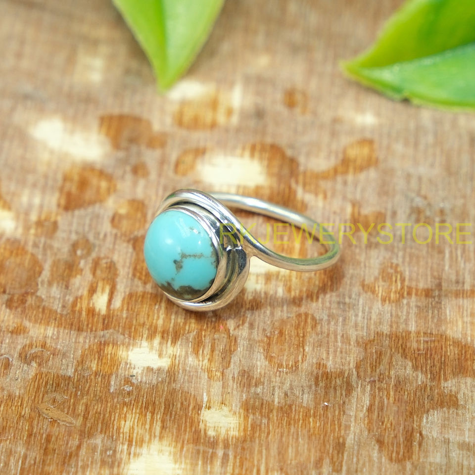 แหวนเงินแท้ 925 ประดับพลอยเทอร์ควอยซ์ธรรมชาติทรงกลมแบบคาโบชอง สีฟ้า ดีไซน์โบโฮสำหรับผู้หญิง