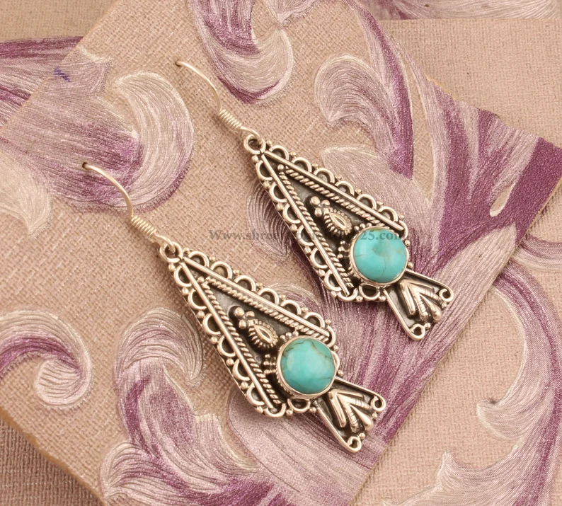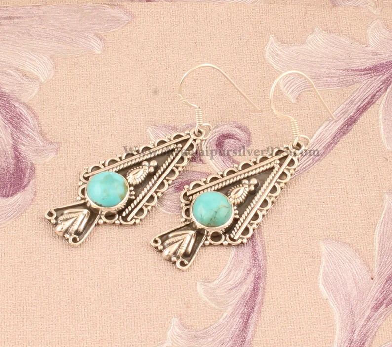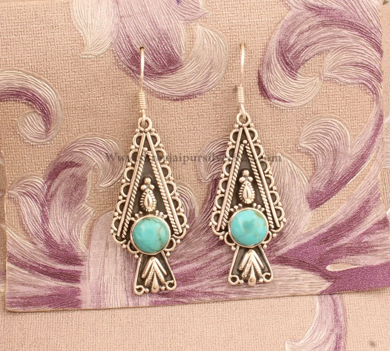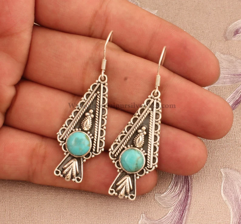 ต่างหูเงินแท้ 925 ประดับด้วยเทอร์ควอยซ์ธรรมชาติทรงหยดน้ำ ดีไซน์อินเดีย งานแฮนด์เมด สไตล์โบฮีเมียน ใส่สบายผิว เหมาะสำหรับทุกเพศ