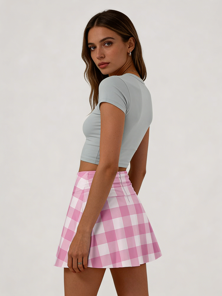 กระโปรงเทนนิสทรงเอไลน์สีชมพูลายตารางกิงแฮมเอวธรรมชาติ พร้อมกางเกงซับในในตัว ผลิตจากใยนม ยืดหยุ่นสูง
