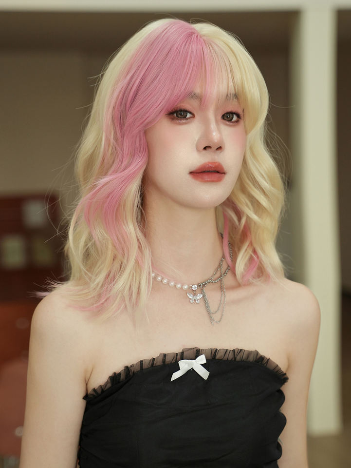 วิกผมสีบลอนด์และสีชมพูแบบธรรมชาติ ลอนคลื่น พร้อมหน้าม้า วิกผมบ๊อบสั้น วิกผมยาวประบ่าสำหรับผู้หญิง วิกผมคอสเพลย์ ครูเอลลา เดวิลล์ ผมสังเคราะห์