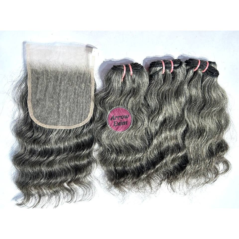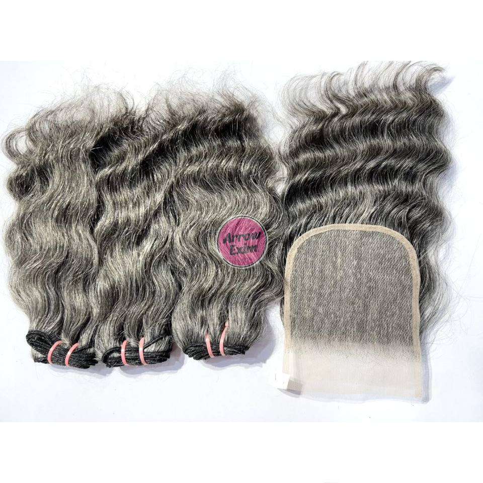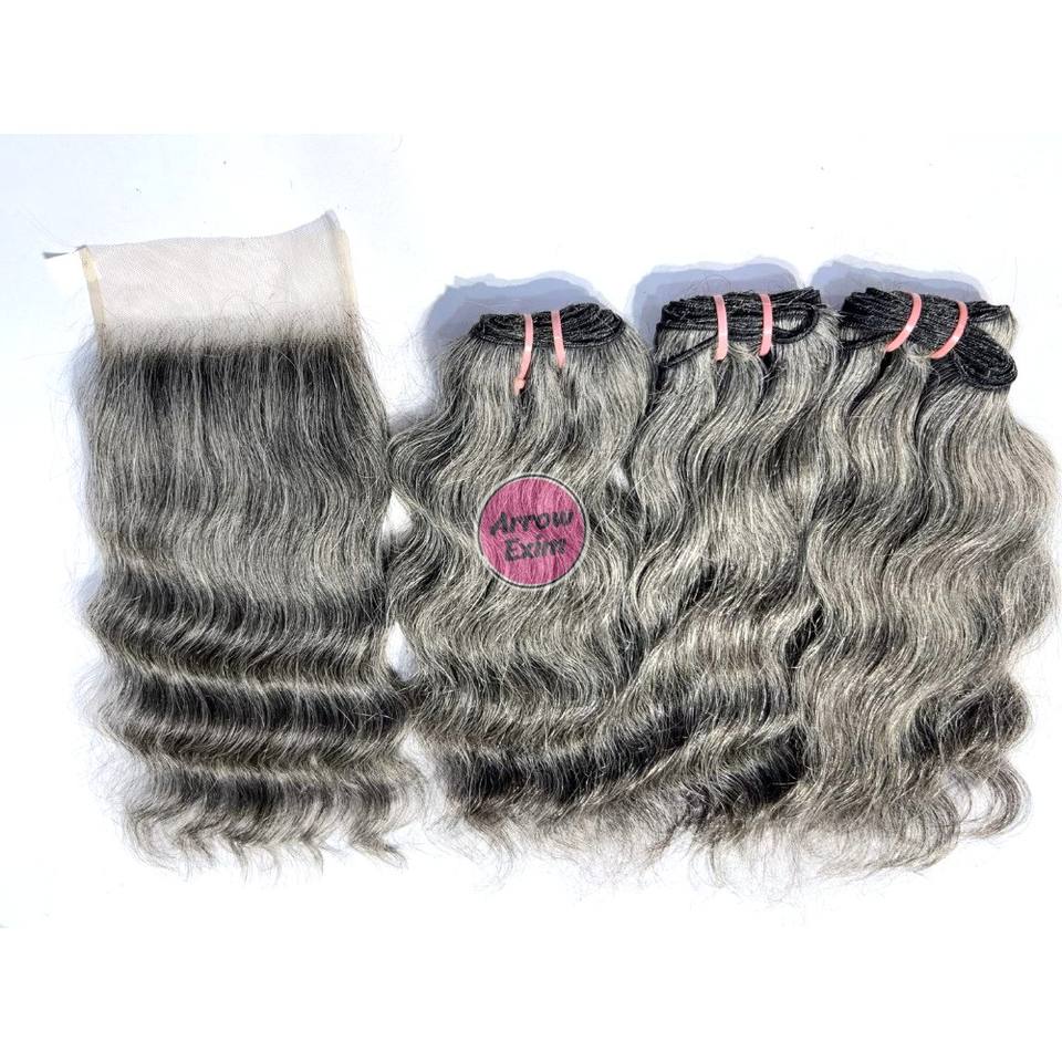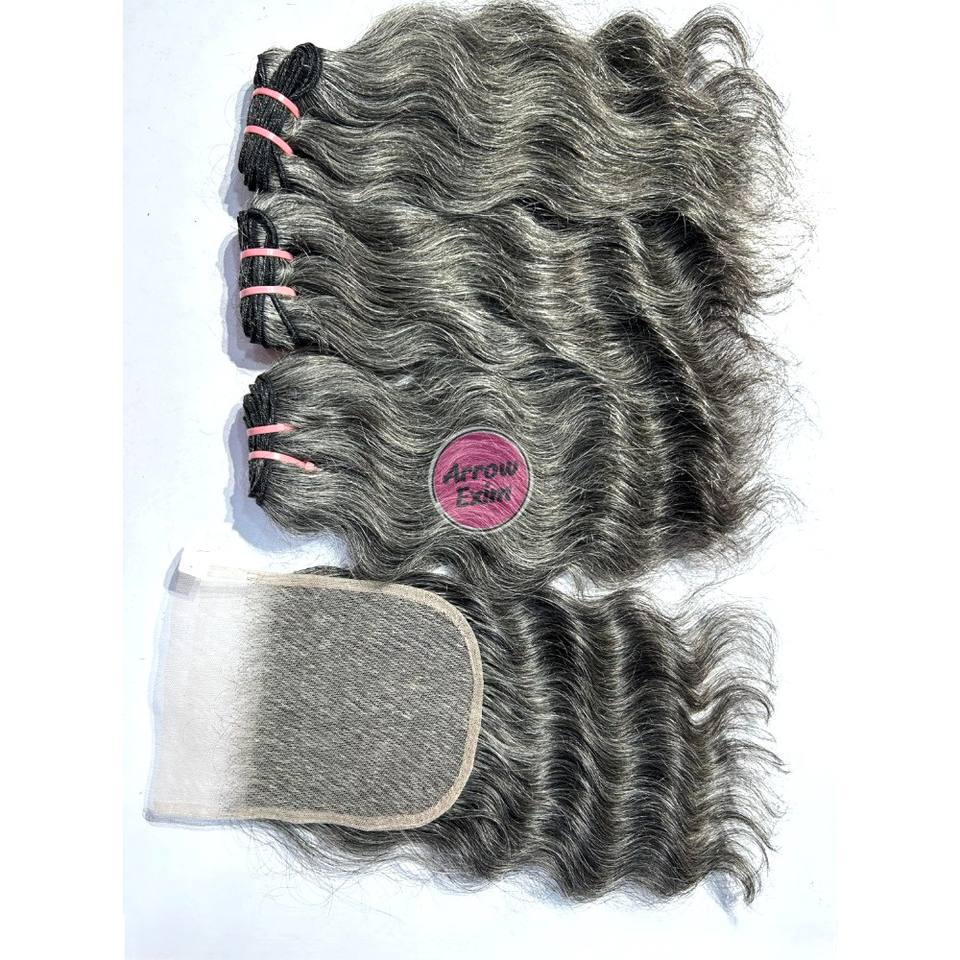 ผมแท้สีเทาแบบลอนธรรมชาติ ชุด 3 มัด พร้อมเชือกผูกปิดผม
