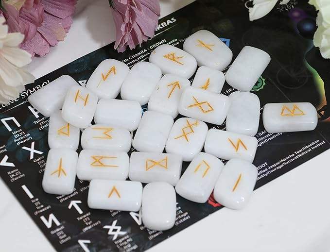 ชุดอักษรรูนสีขาวธรรมชาติ-หินคริสตัลทรงสี่เหลี่ยมพร้อมสัญลักษณ์ Futhark อาวุโส