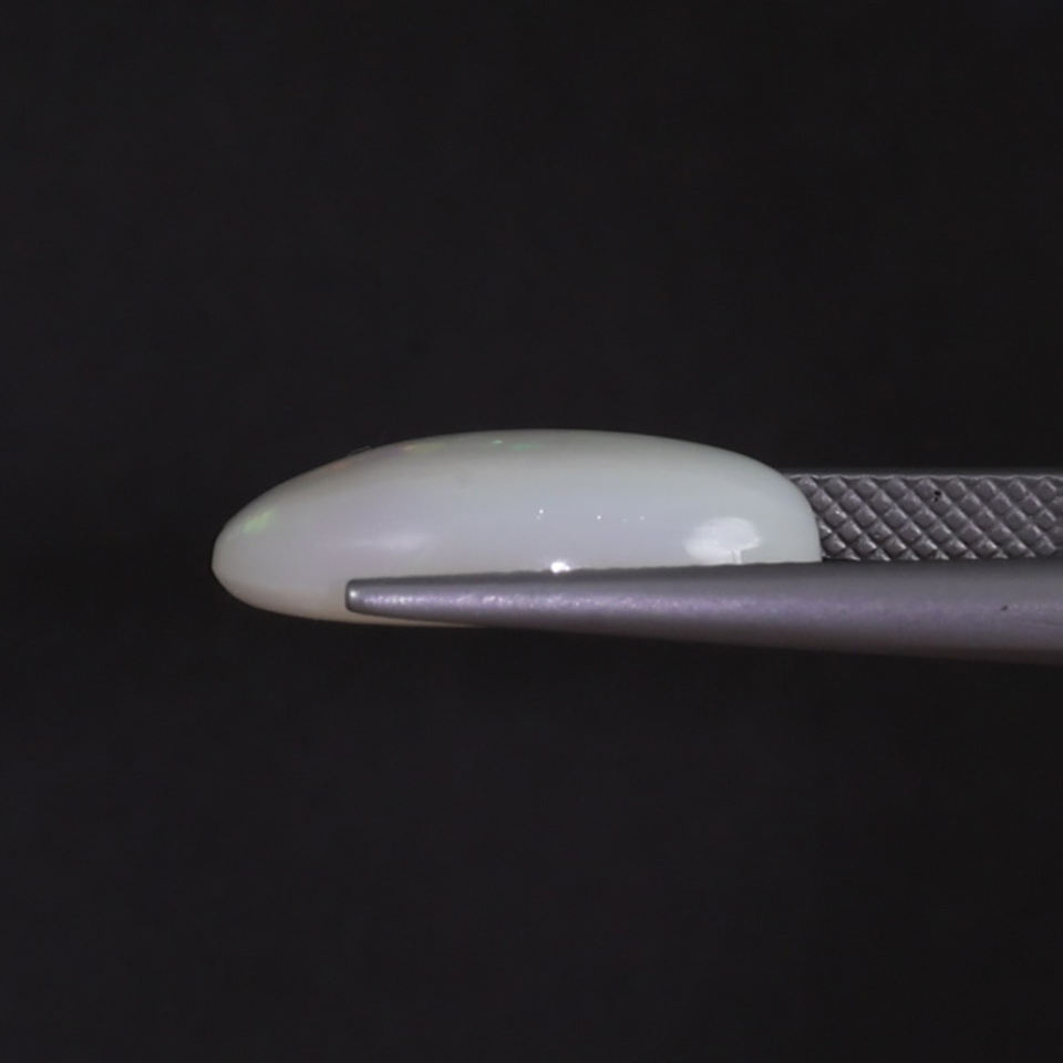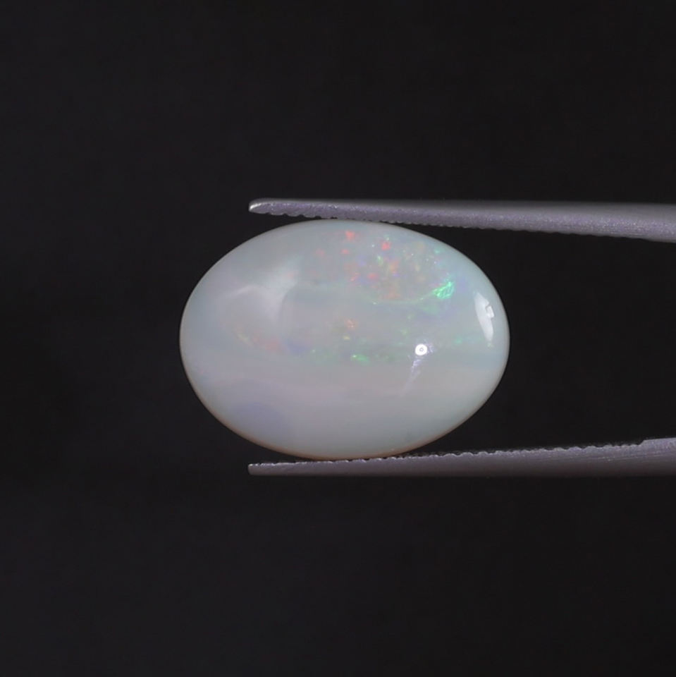 โอปอลสีขาวธรรมชาติ รูปไข่ 6.83 กะรัต ขนาด 17x12.5 มม. ได้รับการรับรองจาก IGI ขัดเงาด้วยมือ ผ่านการเคลือบแว็กซ์/น้ำมัน