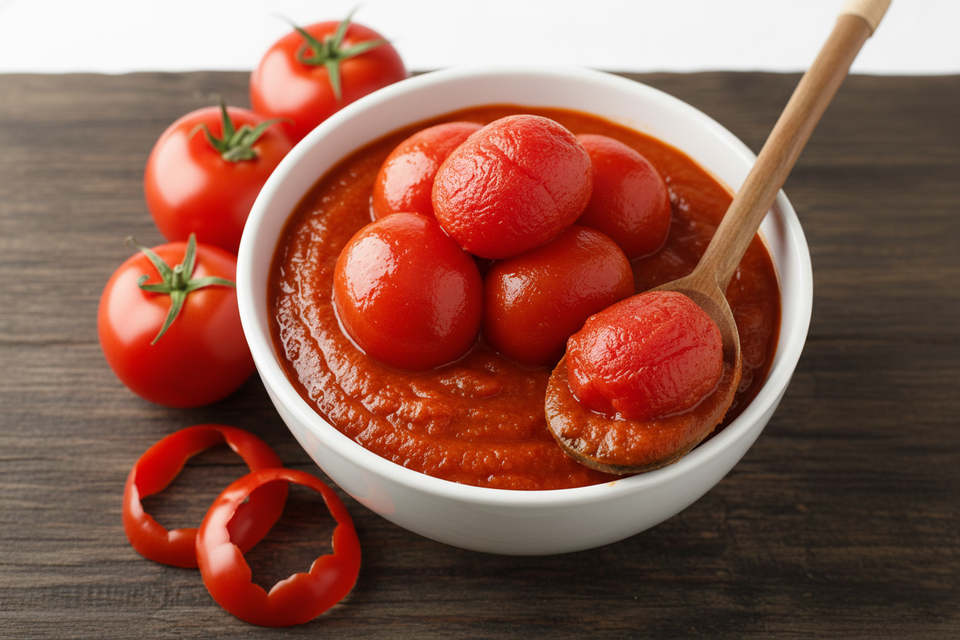 มะเขือเทศทั้งลูกปอกเปลือกในน้ำมะเขือเทศเข้มข้นบรรจุกระป๋องสำหรับทำซอส ซุป และพาสต้า