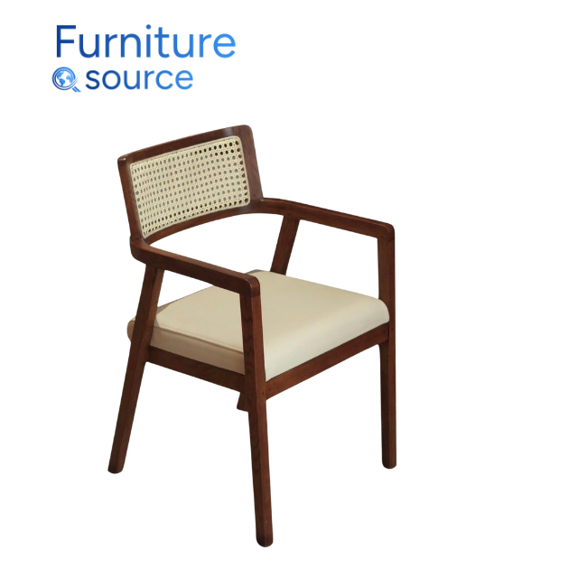 เก้าอี้รับประทานอาหารทำจากไม้ธรรมชาติพร้อมที่รองหลังทำจากหวายถักและที่นั่งหุ้มเบาะสำหรับบ้าน/ร้านอาหาร