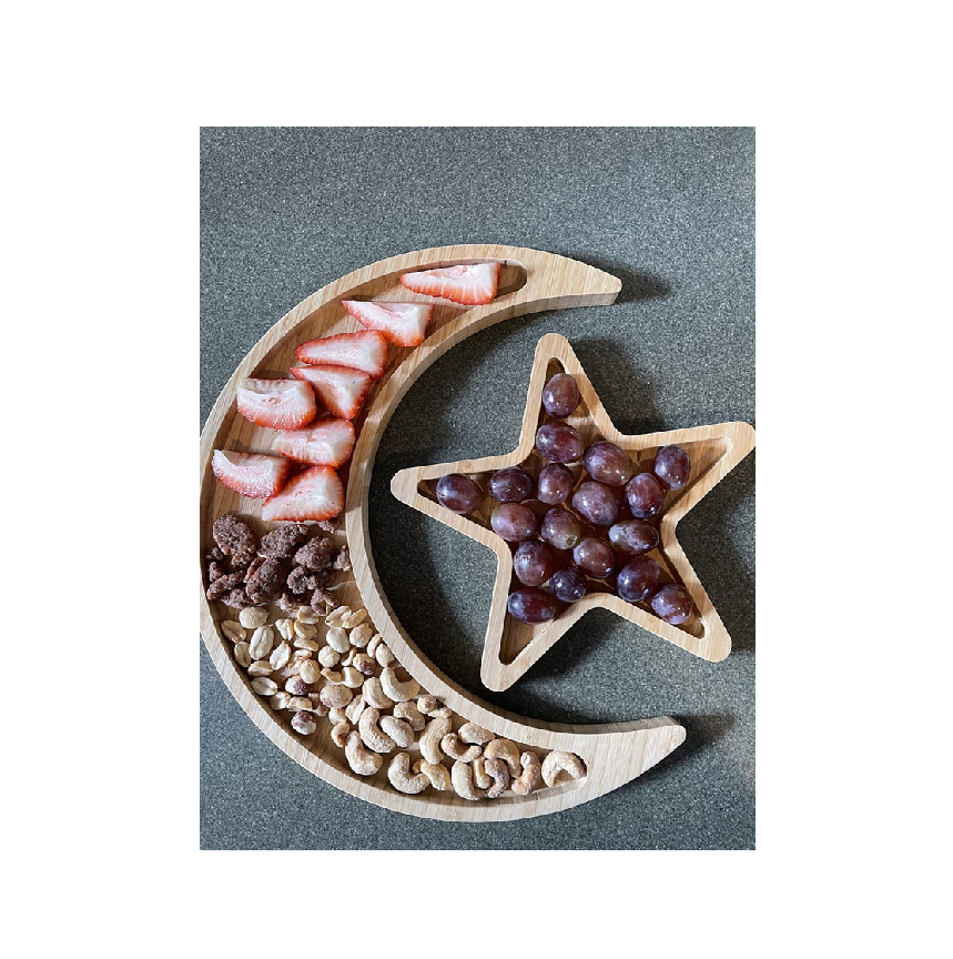 ถาดไม้ธรรมชาติรูปพระจันทร์และดวงดาวสำหรับเสิร์ฟในเดือนรอมฎอน ถาดตกแต่งสำหรับวันอีดมูบารัค จานเสิร์ฟผลไม้ ขนมหวาน คัพเค้ก สำหรับงานเลี้ยงที่บ้าน ขนาดใหญ่
