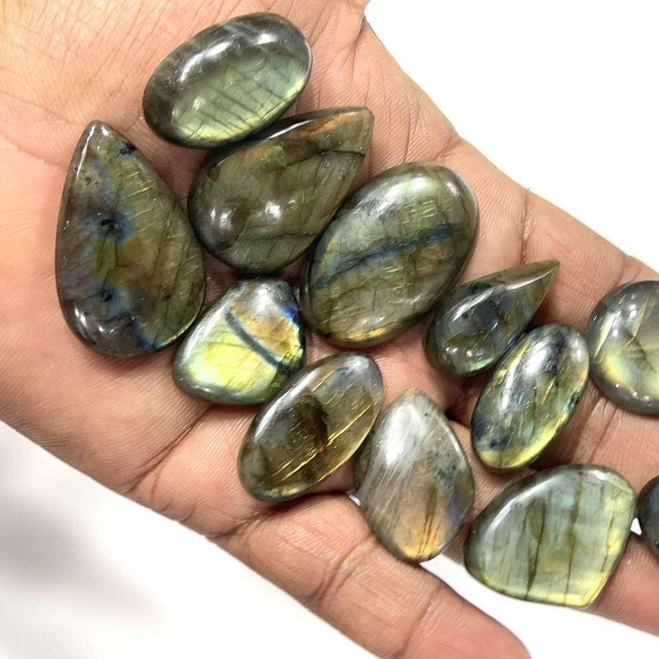 ลาบราดอไรต์สีเหลืองธรรมชาติ รูปทรงคาโบชอง ขนาดคละ 20 ถึง 30 มม. ประมาณนั้น