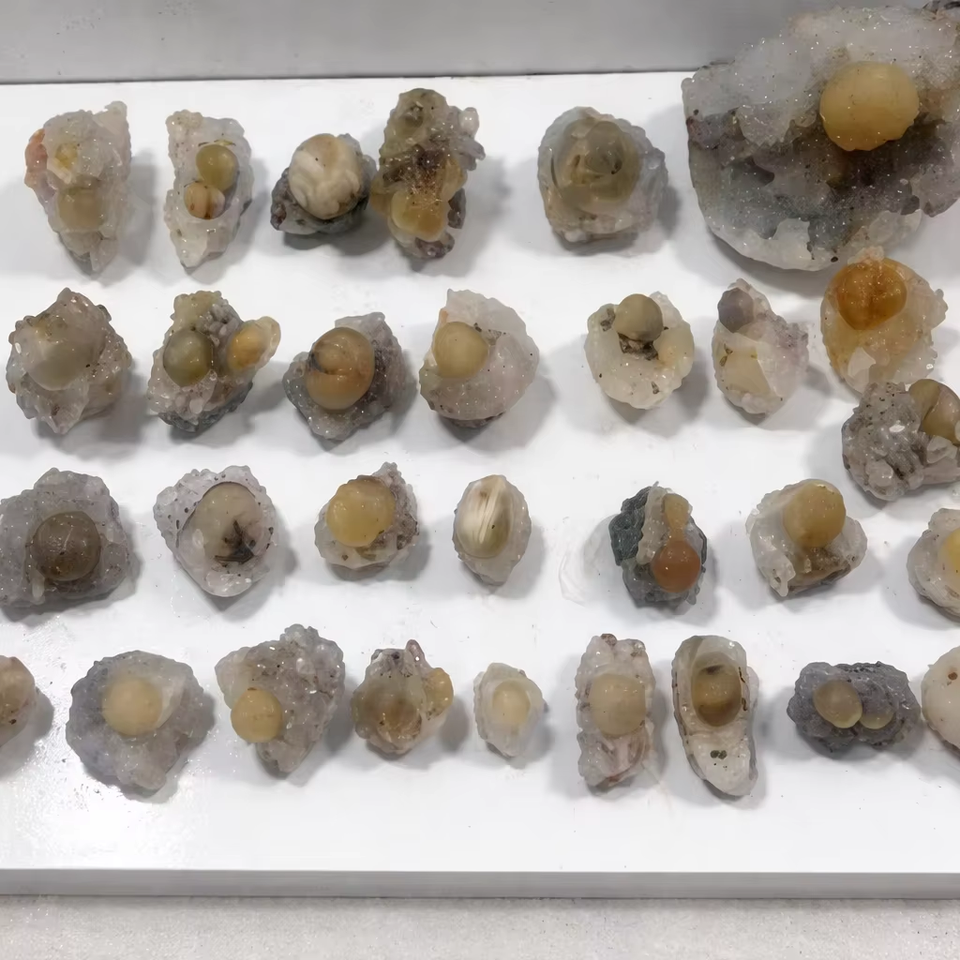 ลูกบอลฟลูออไรต์สีเหลืองธรรมชาติบนแร่ควอตซ์ MM ชุดตัวอย่างคริสตัลพรีเมียมสำหรับจัดแสดง คอลเลกชันตกแต่ง ชุดของขวัญเพื่อการบำบัด