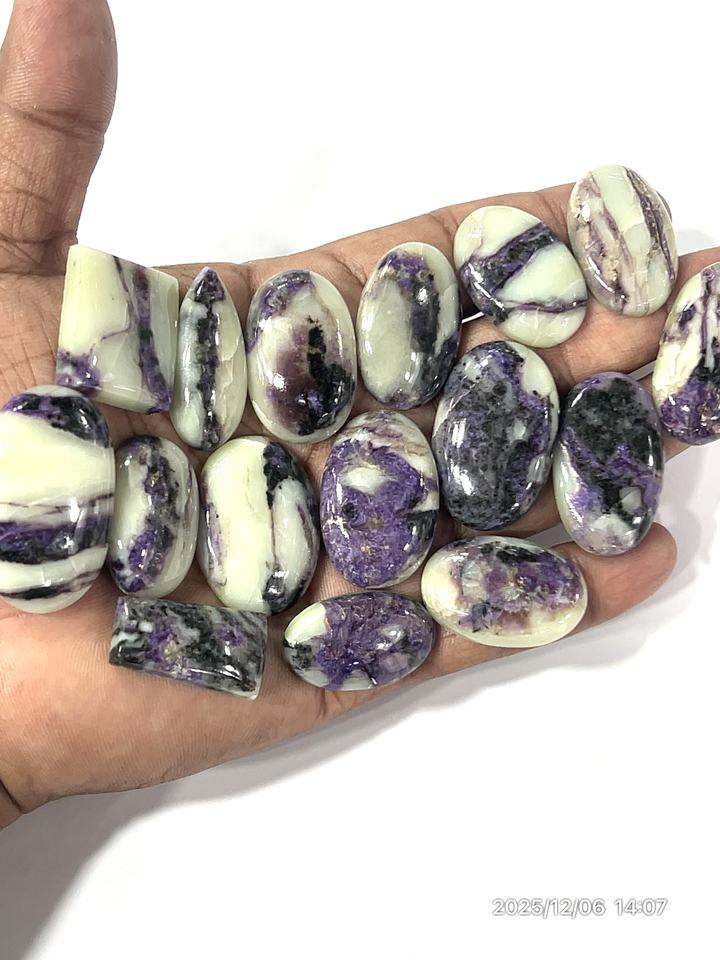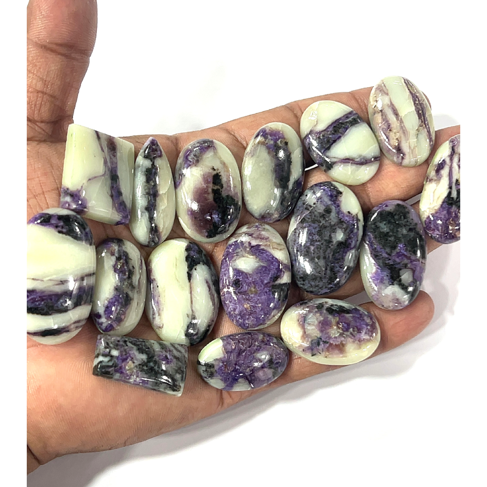 พลอยชารอยต์สีเหลืองม่วงธรรมชาติทรงหลวมแบบคาโบชอง ขนาดคละไซส์ ประมาณ 20 ถึง 30 มม.