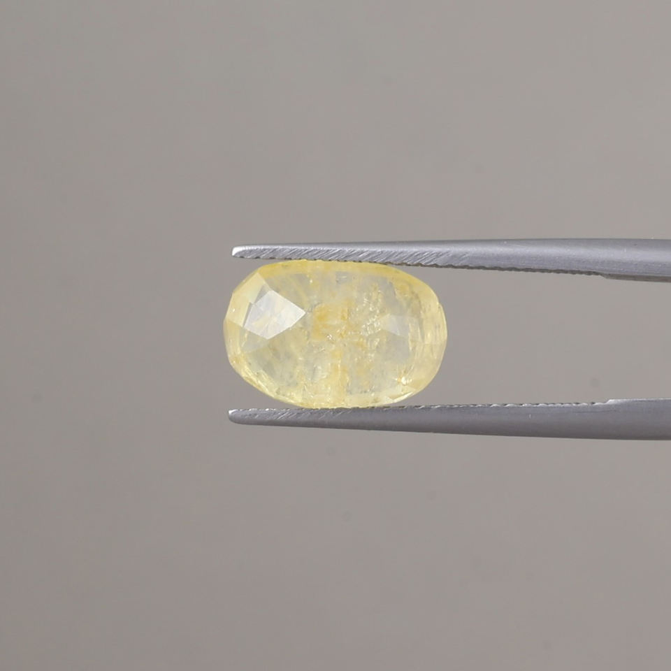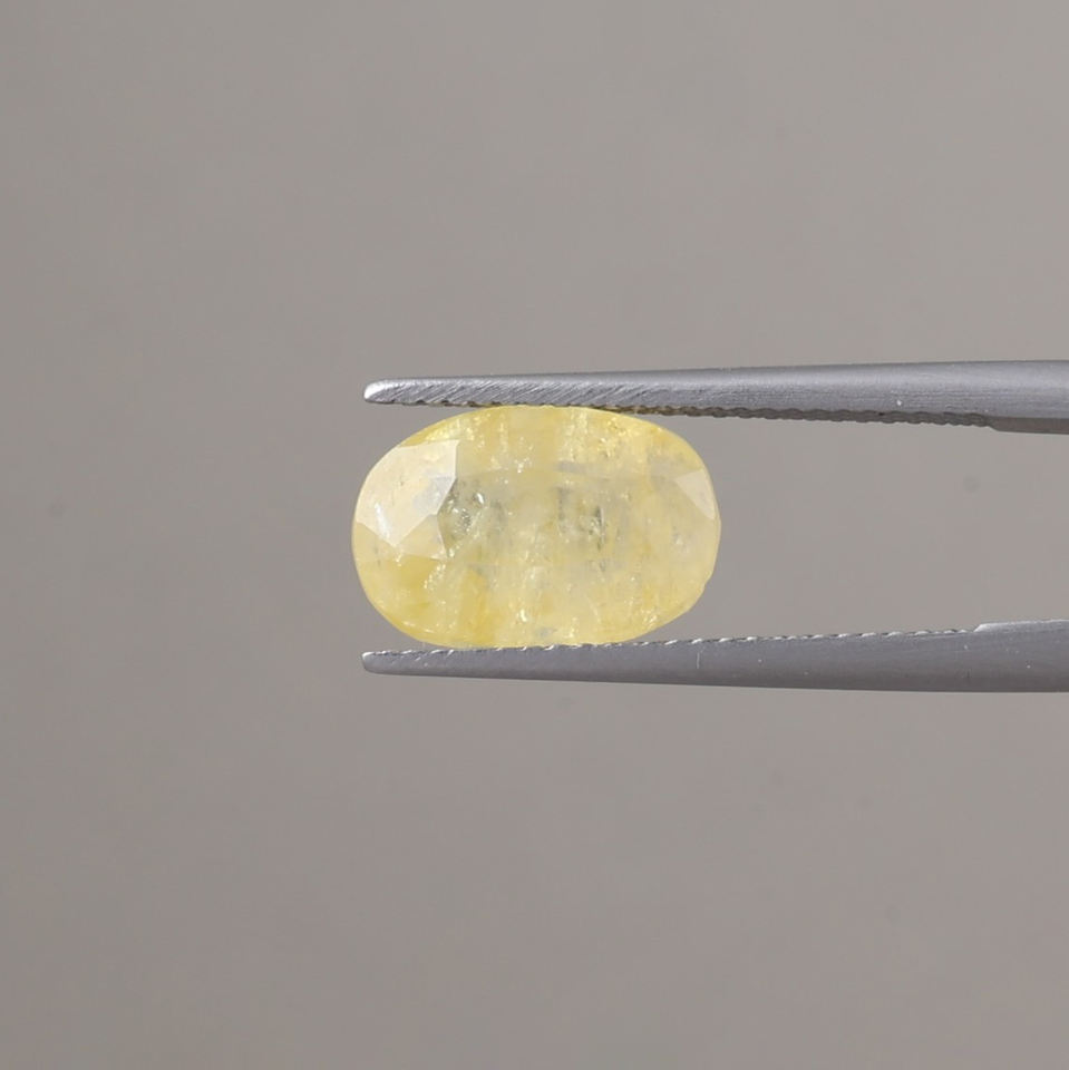 พลอยไพลินสีเหลืองธรรมชาติ รูปไข่ ขนาด 12x8 มม. น้ำหนัก 6.71 กะรัต ได้รับการรับรองจาก IGI สำหรับทำเครื่องประดับ เปลี่ยนสีได้ 100% จากธรรมชาติ