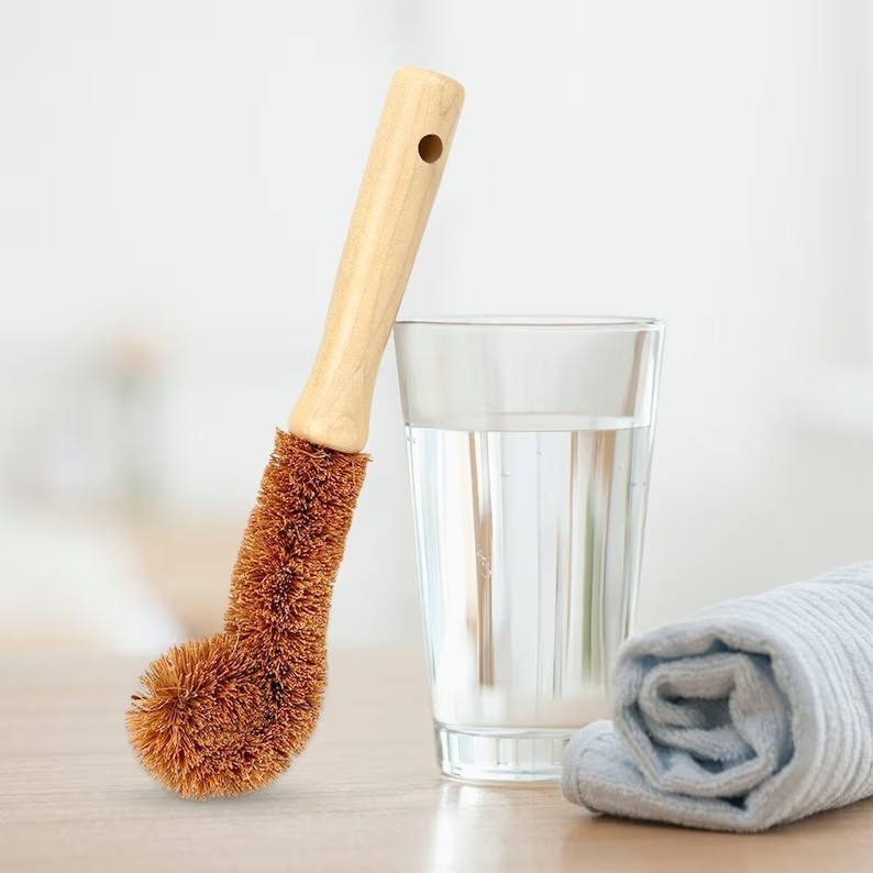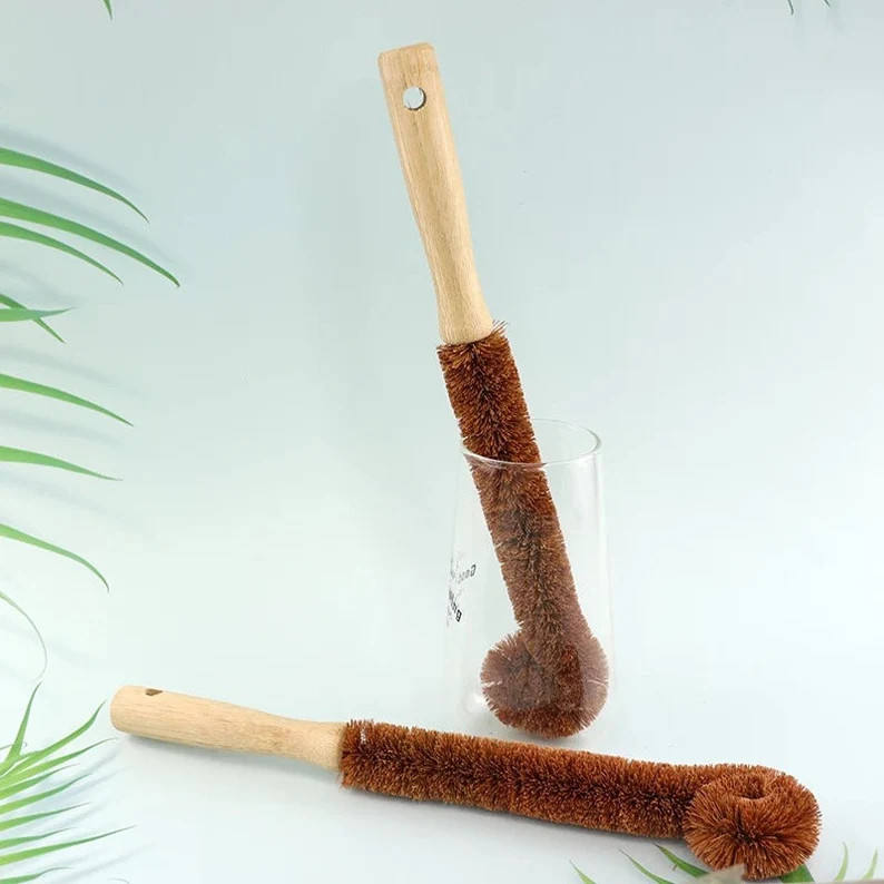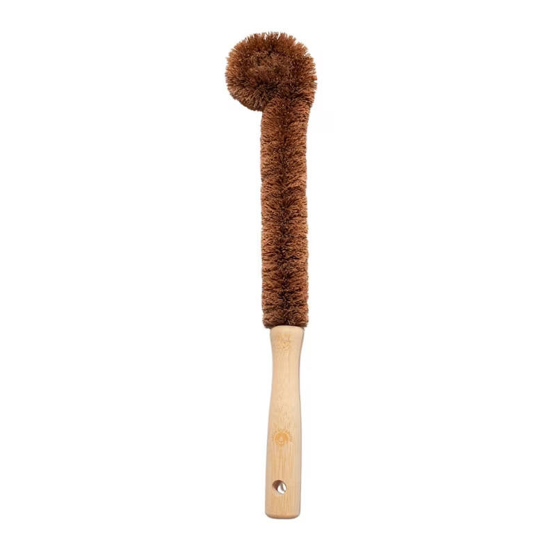 แปรงใยมะพร้าวธรรมชาติพร้อมที่จับแปรงทรงขวดที่เป็นมิตรต่อสิ่งแวดล้อมอุปกรณ์ทำความสะอาดเครื่องครัว