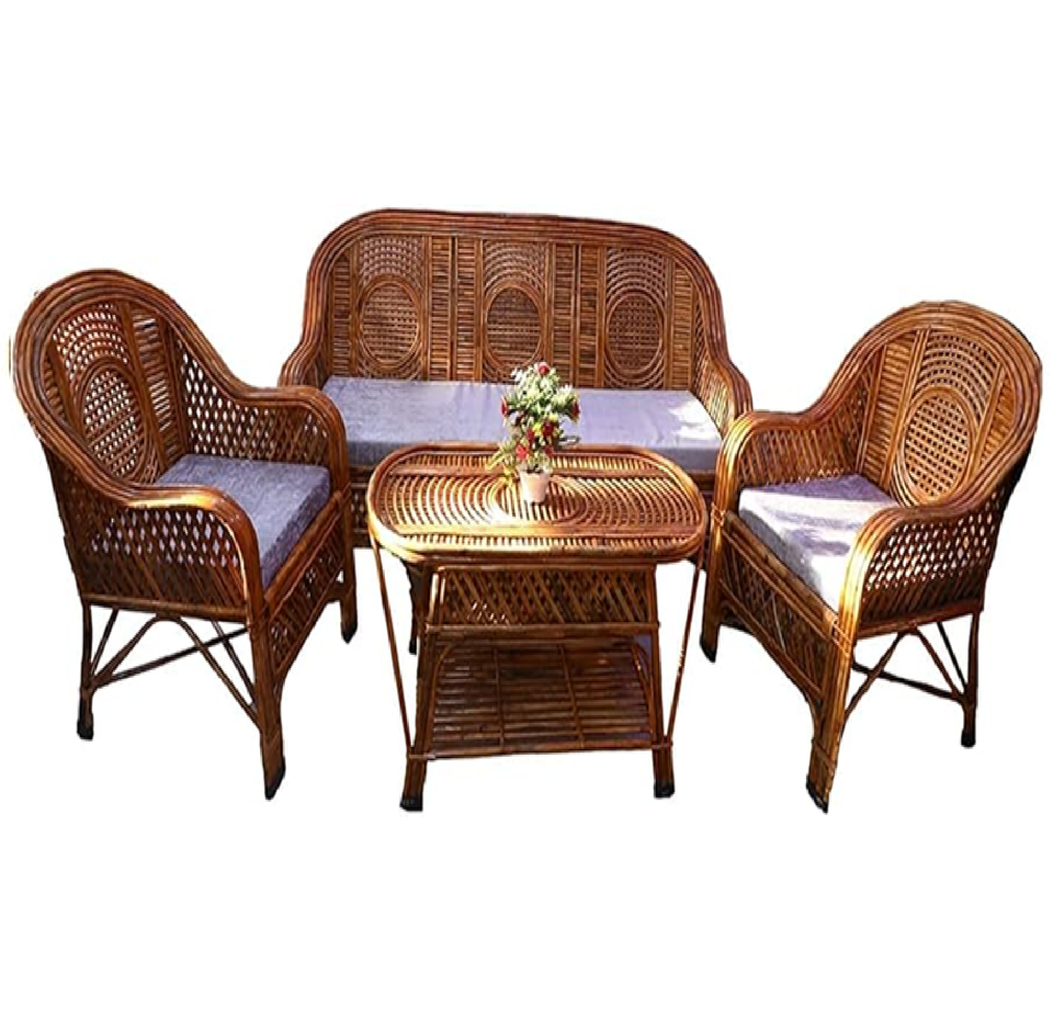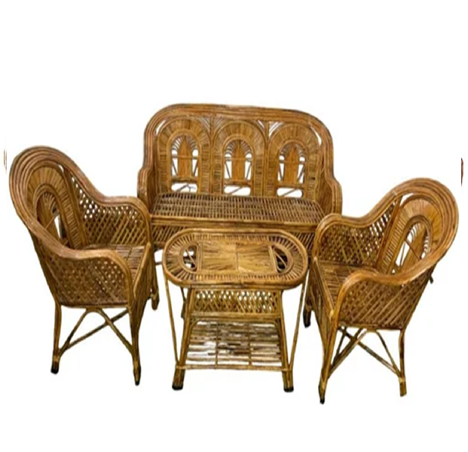 ชุดโซฟาไม้ไผ่เคลือบเงาธรรมชาติ3-seater มีเก้าอี้นวม2ตัวเบาะหลังโค้งหมอนอิงสีแดง