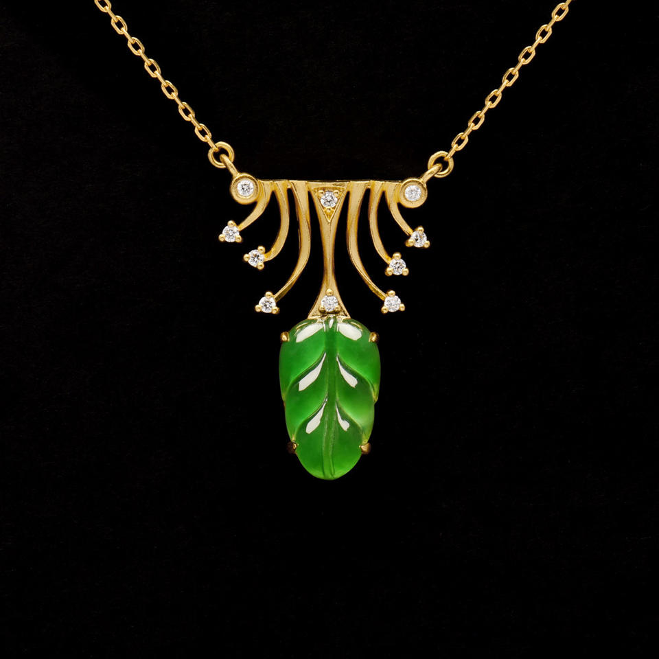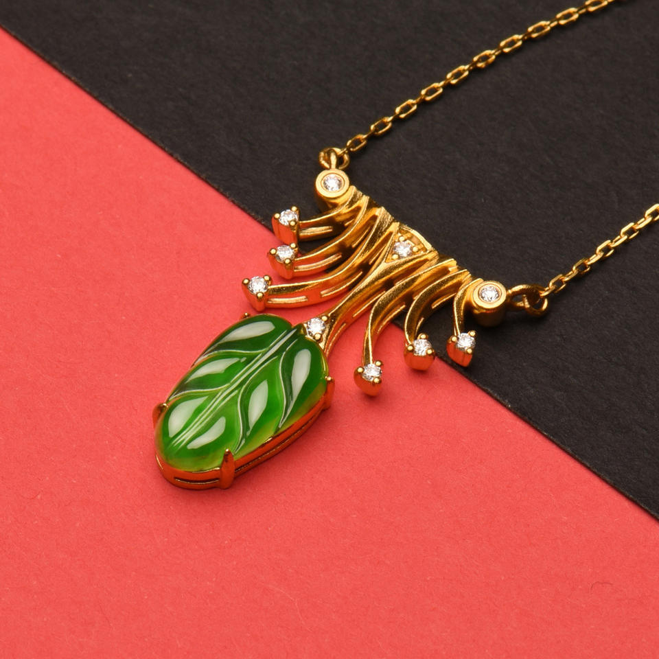 หยกเจไดต์ เฟ่ยชุย เกรด A แท้จากธรรมชาติ สร้อยคอทองคำ 24K พร้อมจี้รูปใบไม้แห่งความสงบ สร้อยคอทองคำ สไตล์ระดับไฮเอนด์