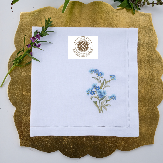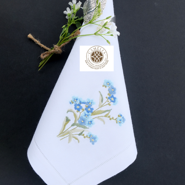 ผ้าลินินธรรมชาติปักลายดอกฟอร์เก็ตมีน็อต นุ่มแต่ทนทาน สร้างสัมผัสอ่อนโยนและอบอุ่นให้กับโต๊ะ