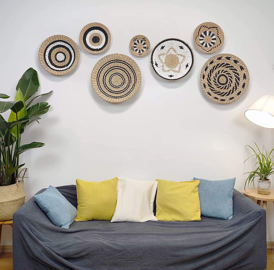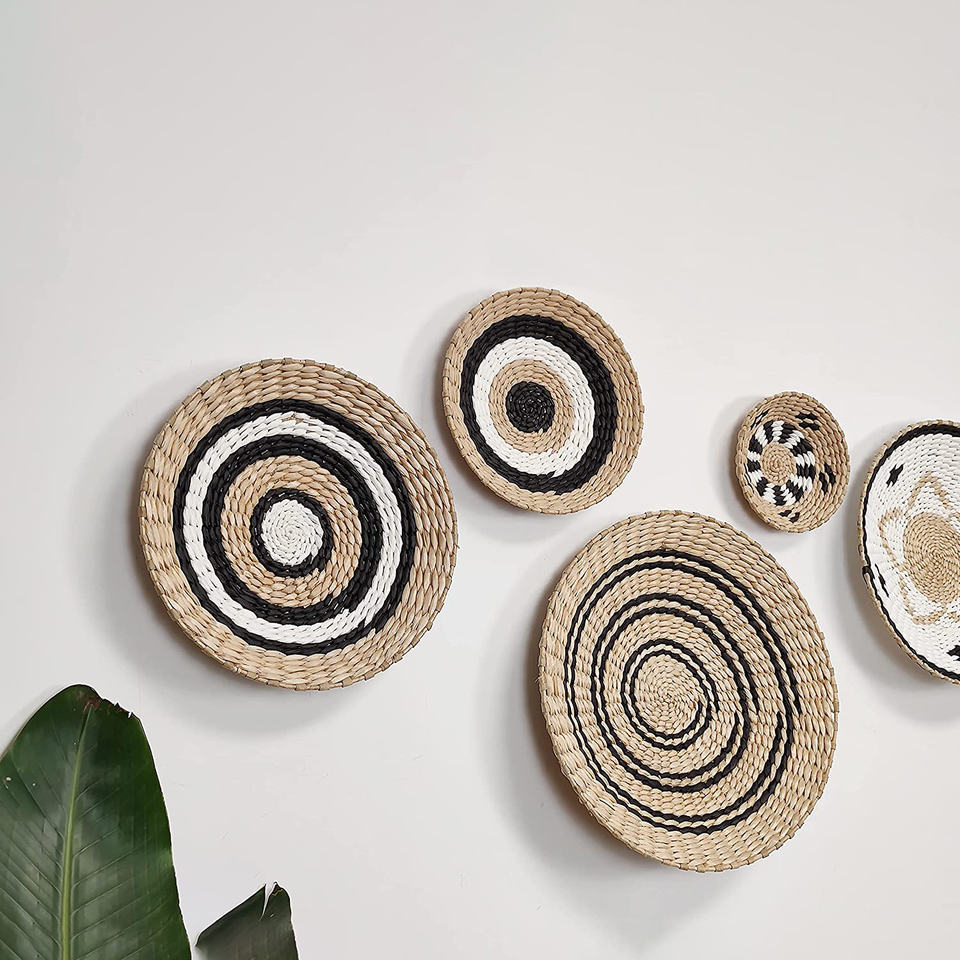 งานศิลปะแขวนผนังแบบธรรมชาติ ตะกร้าแขวนผนังสไตล์โบโฮสำหรับห้องนั่งเล่น ตะกร้าแขวนทำจากผักตบชวาสุดหรู