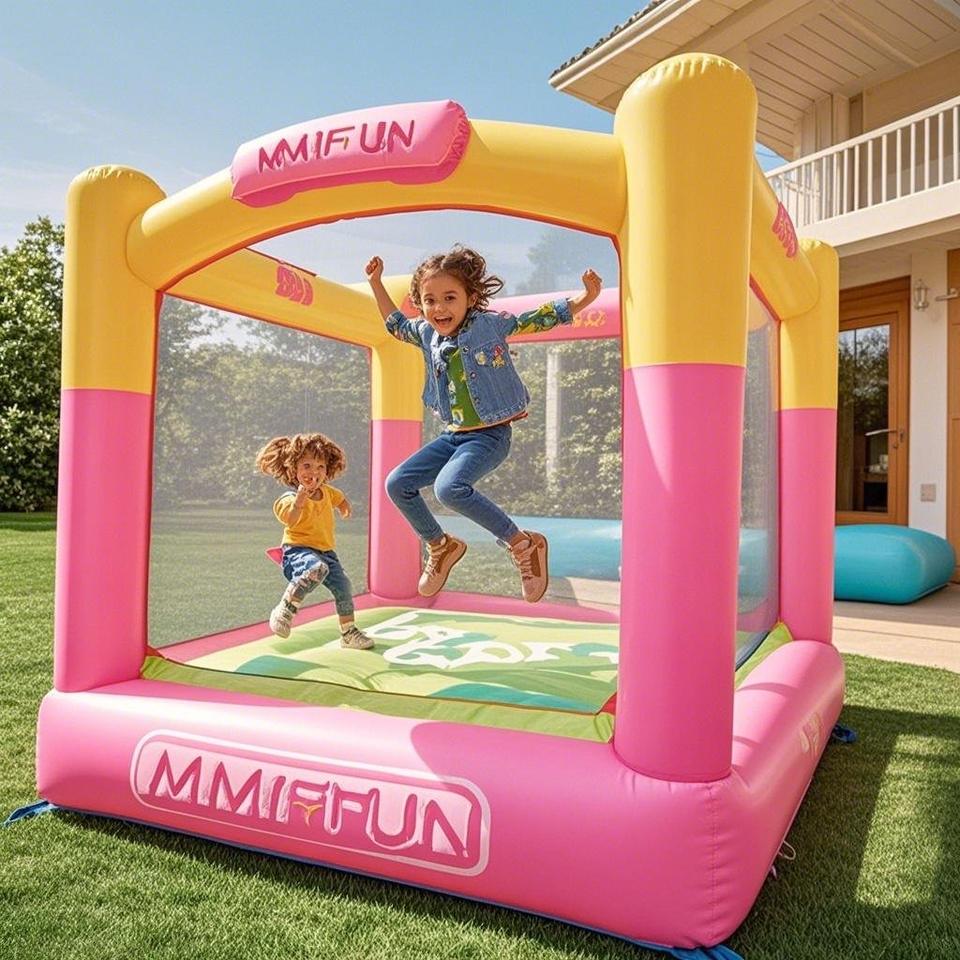 บ้านตีกลับแบบเป่าลมพร้อมห่วงบาสเก็ตบอลแบบสไลด์อุปกรณ์กลางแจ้งที่ทนทานสำหรับเด็กเล่นซน