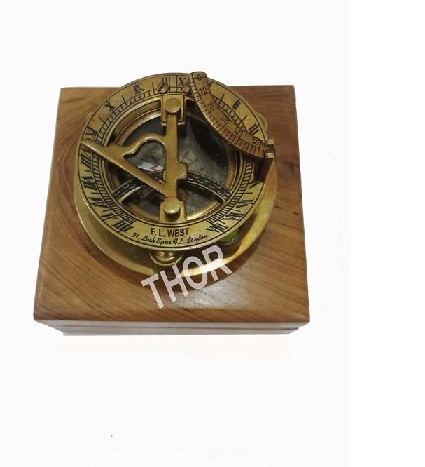 เข็มทิศนาฬิกาแดดแบบโบราณ - เข็มทิศนาฬิกาแดดทองเหลืองแท้สวยงาม F.L West ขนาด 2.5 นิ้ว พร้อมกล่องไม้ธรรมชาติ