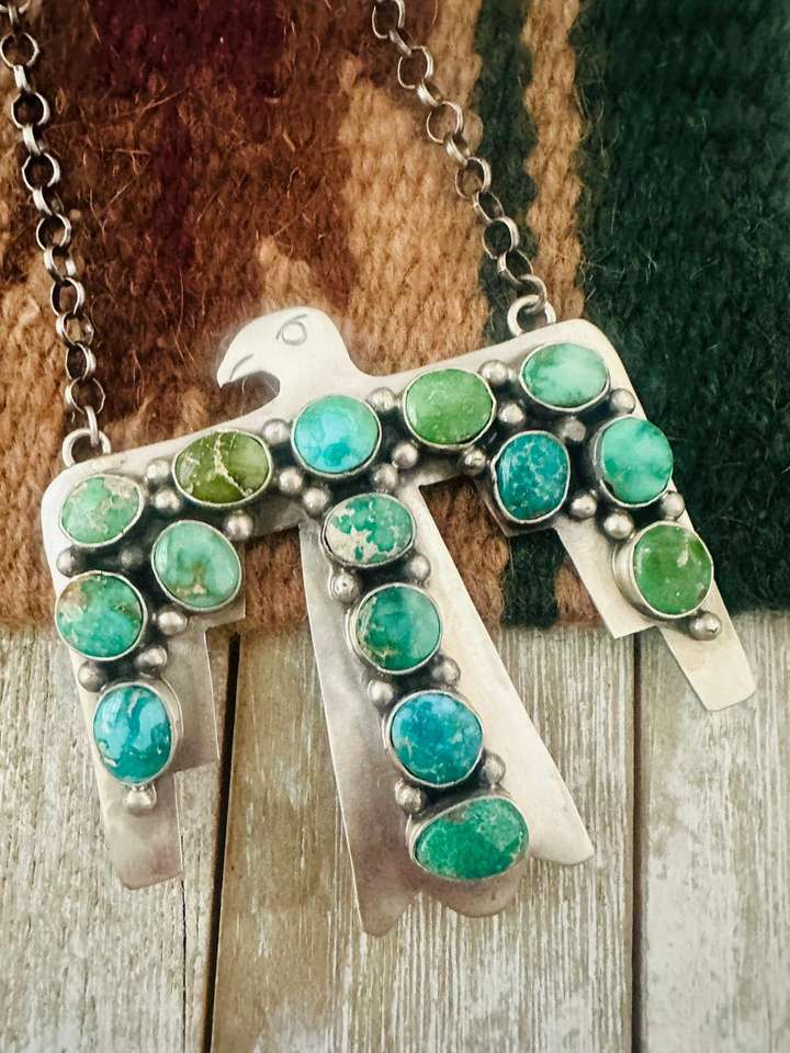 สร้อยรูปนกนาวาโฮธันเดอร์เบิร์ดสีเทอร์ควอยซ์สีเงินสเตอร์ลิงเครื่องประดับพื้นเมืองแฮนด์เมด