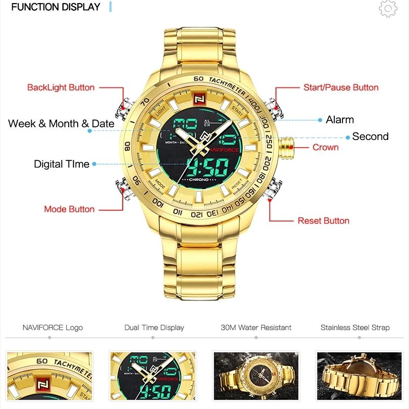 ลักษณะ:โครโนกราฟ, วัน / วัน, กันน้ำ, จอแสดงผล LED, เรืองแสง, สัปดาห์แสดง, มือส่องสว่าง