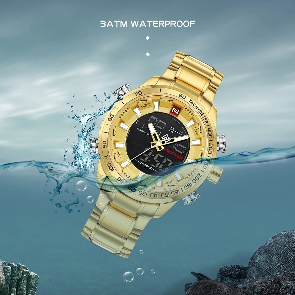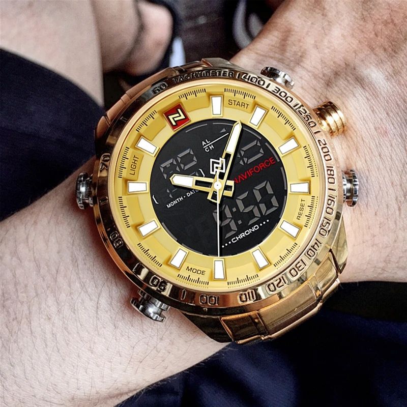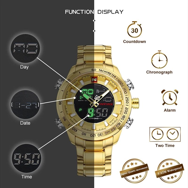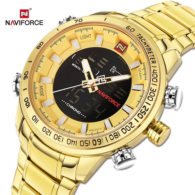 Naviforce นาฬิกาควอตซ์ดิจิทัล LED แนวสปอร์ตกันน้ำทำจากสแตนเลสมัลติฟังก์ชัน9093สำหรับผู้ชาย
